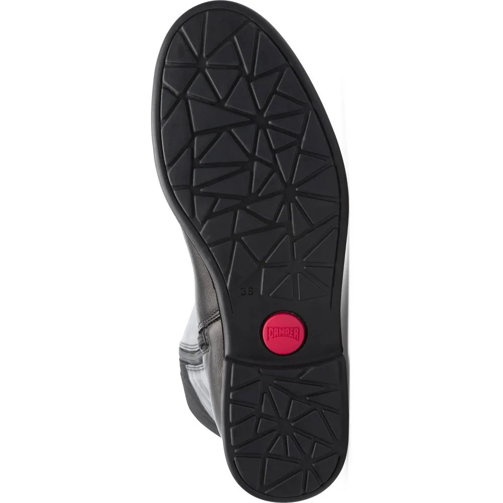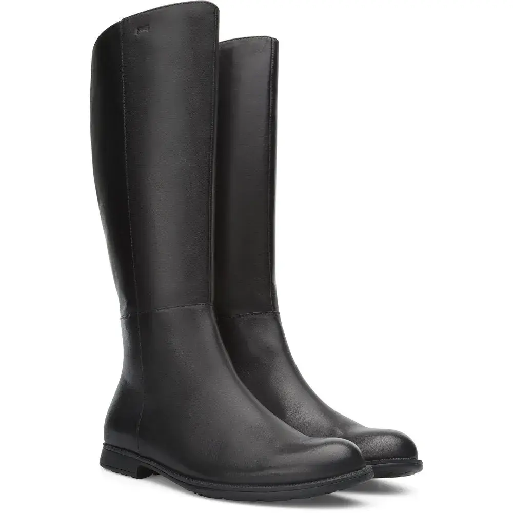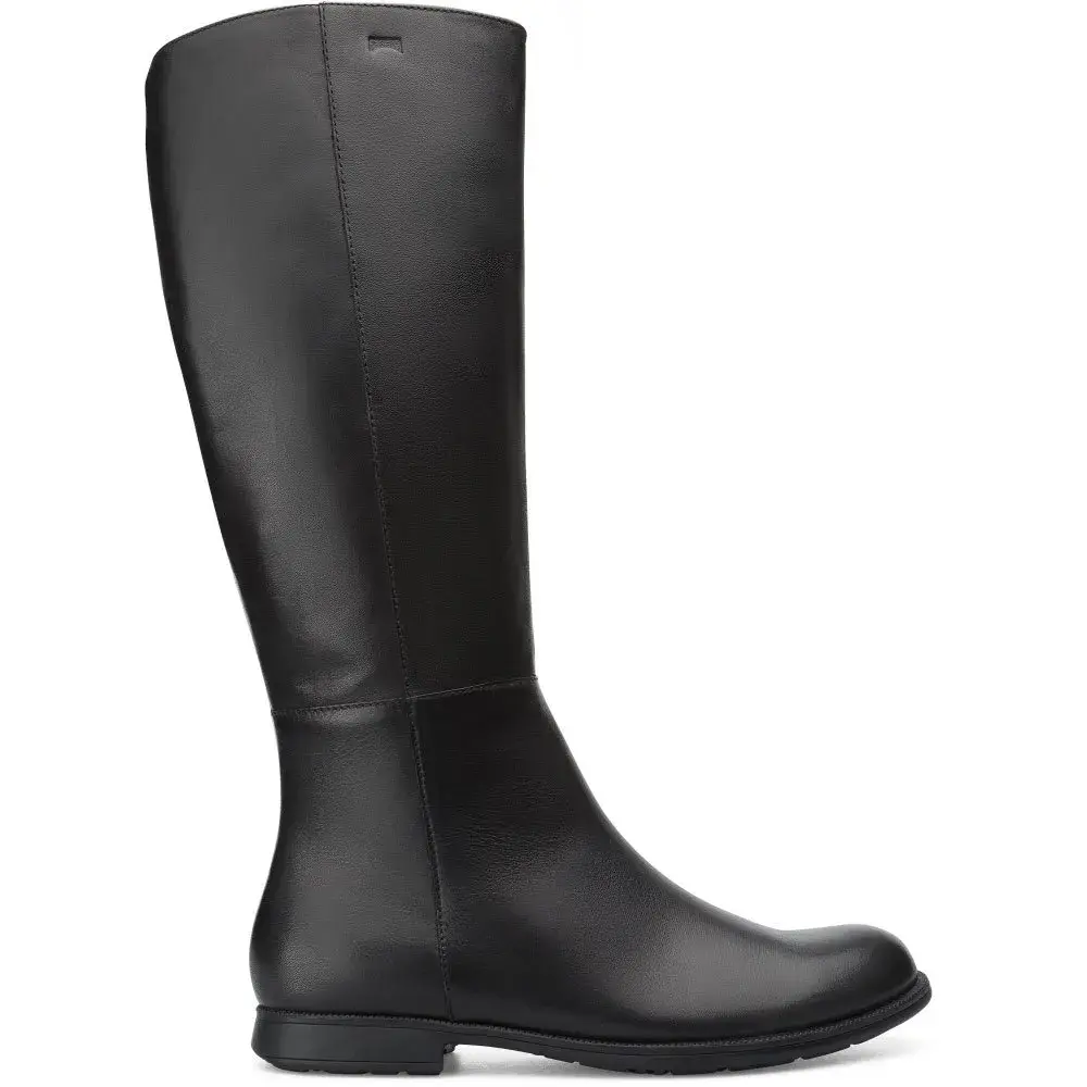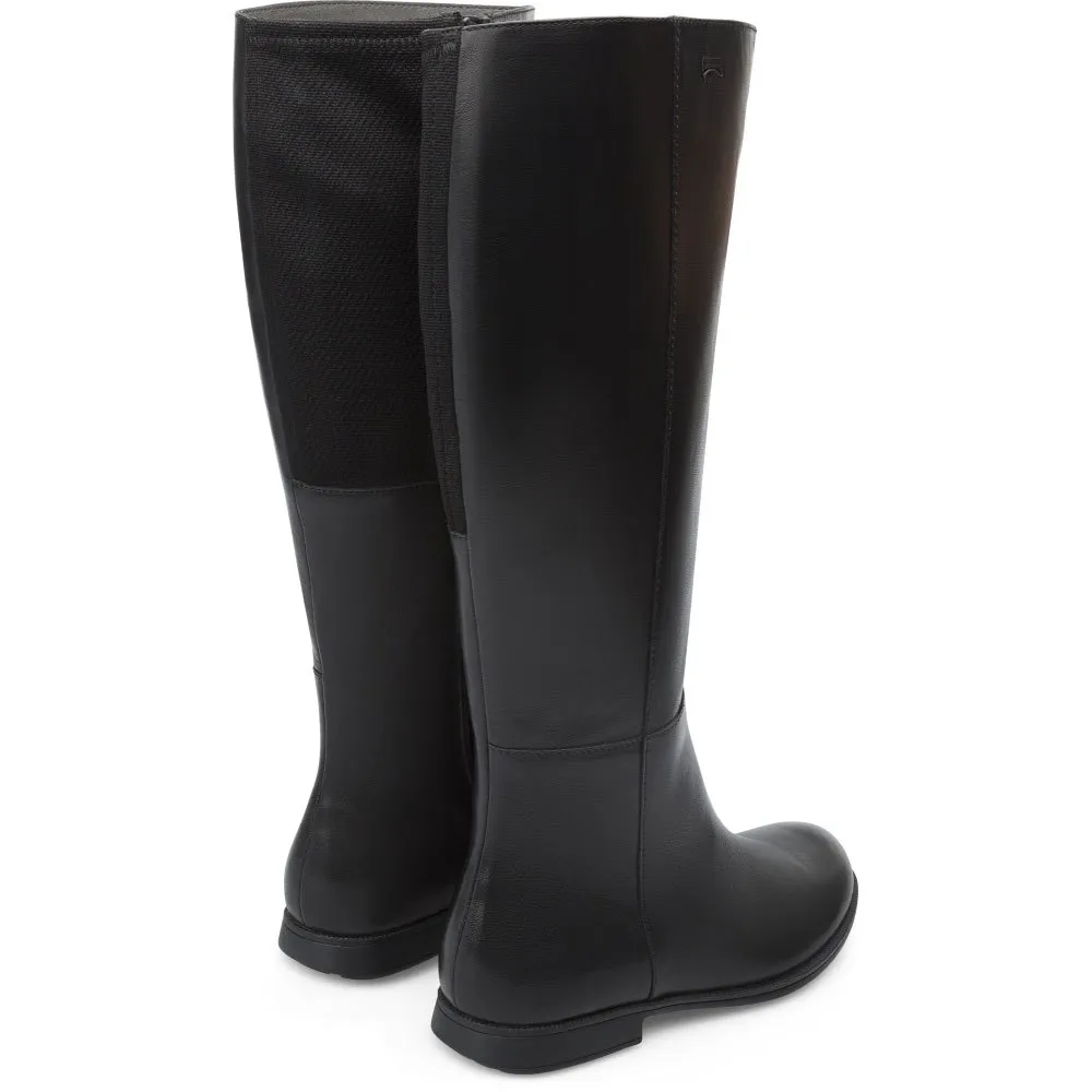 Женские высокие сапоги из черной кожи и текстиля с резиновой подошвой.