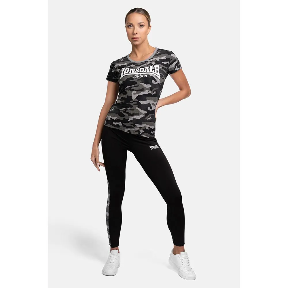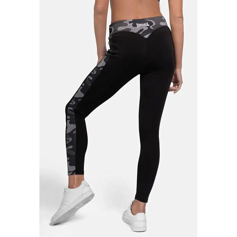 Леггинсы из эластичного материала с современными камуфляжными вставками по бокам и на поясе. На левом бедре и на манжете сзади расположен логотип Lonsdale контрастного цвета.