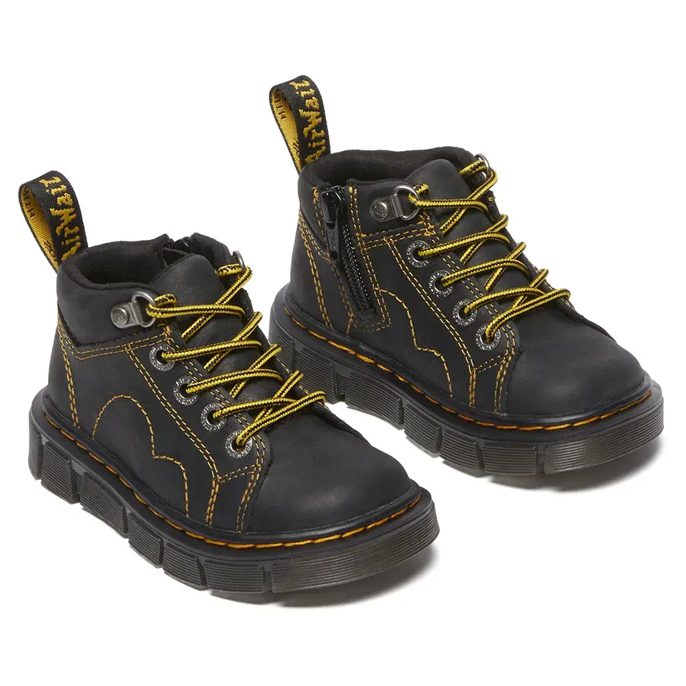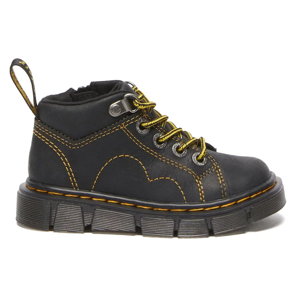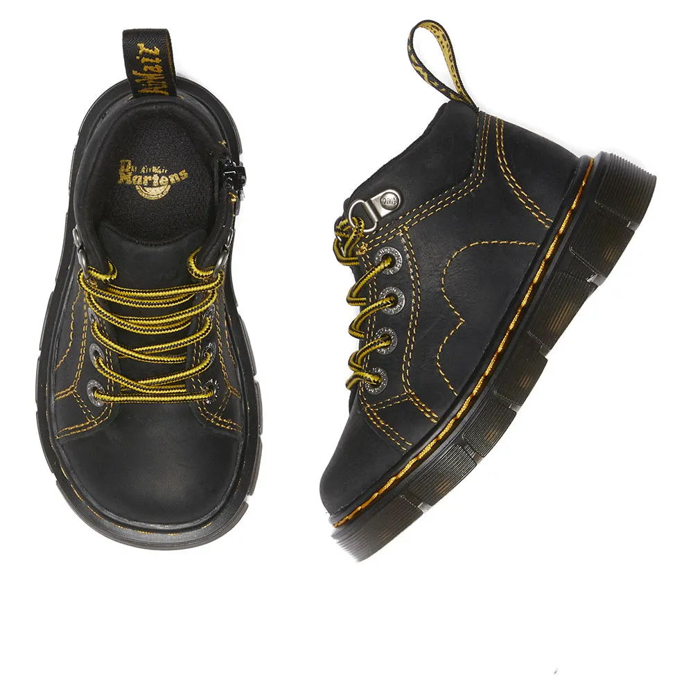 Познакомьте своего малыша с наследием бунтарского стиля и бескомпромиссной долговечности с ботинками Dr. Martens Raffe Church T. Идеальная миниатюрная копия классических взрослых ботинок Church Monkey, эта версия специально разработана для ног юных искателей приключений, которые готовы оставить свой след в мире. Она воплощает всю культовую ДНК Dr. Martens в меньшей, более гибкой упаковке, гарантируя вашему ребенку непревзойденное сочетание вневременной моды и комфорта в течение всего дня. Эти ботинки — не просто обувь; это заявление об индивидуальности и прочности, созданное, чтобы выдерживать суровые условия игровой площадки и при этом выглядеть непринужденно круто.
