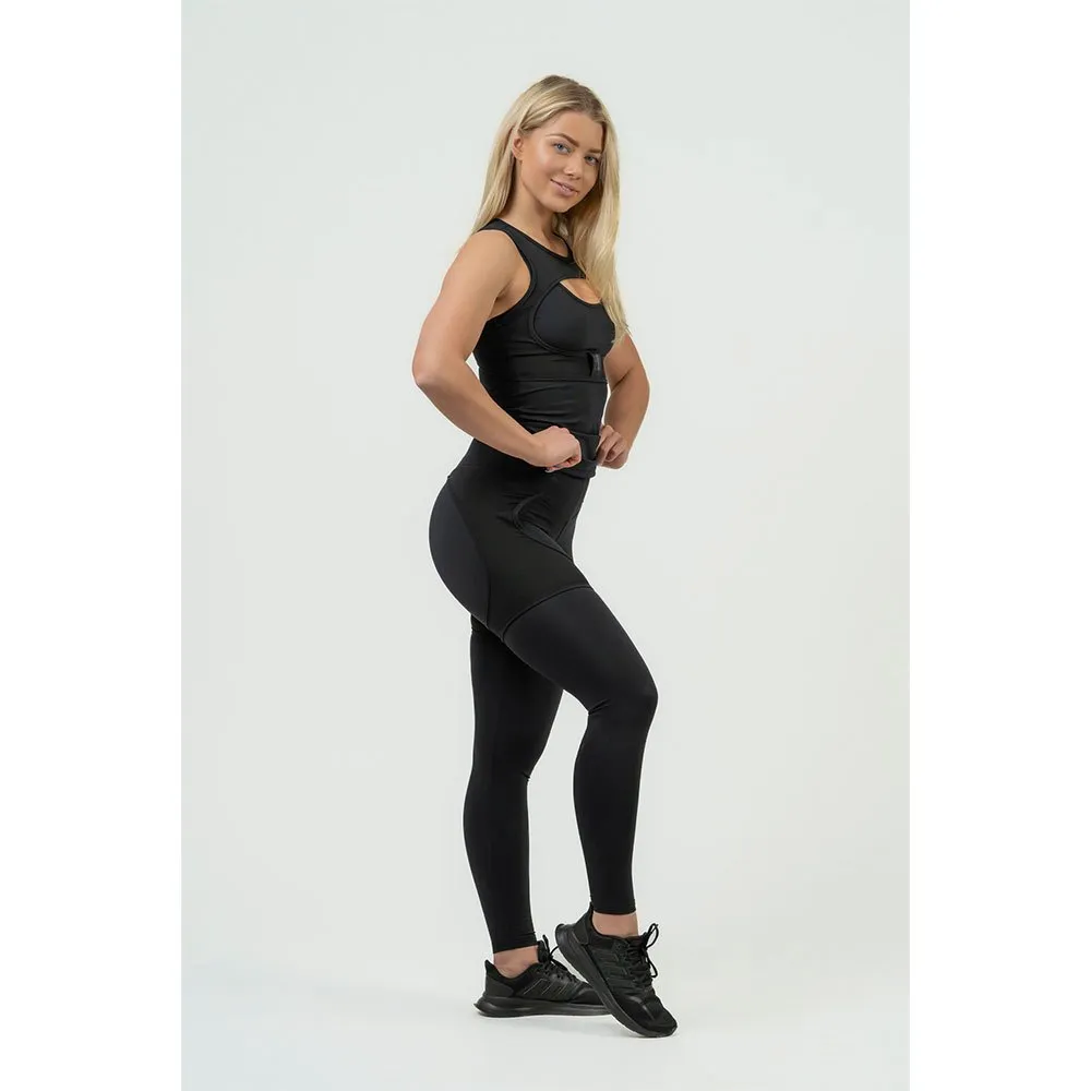 Они имеют высокий пояс и дополнительное усиление по бокам, что позволяет уверенно выполнять приседания и выпады без необходимости постоянно поправлять их.