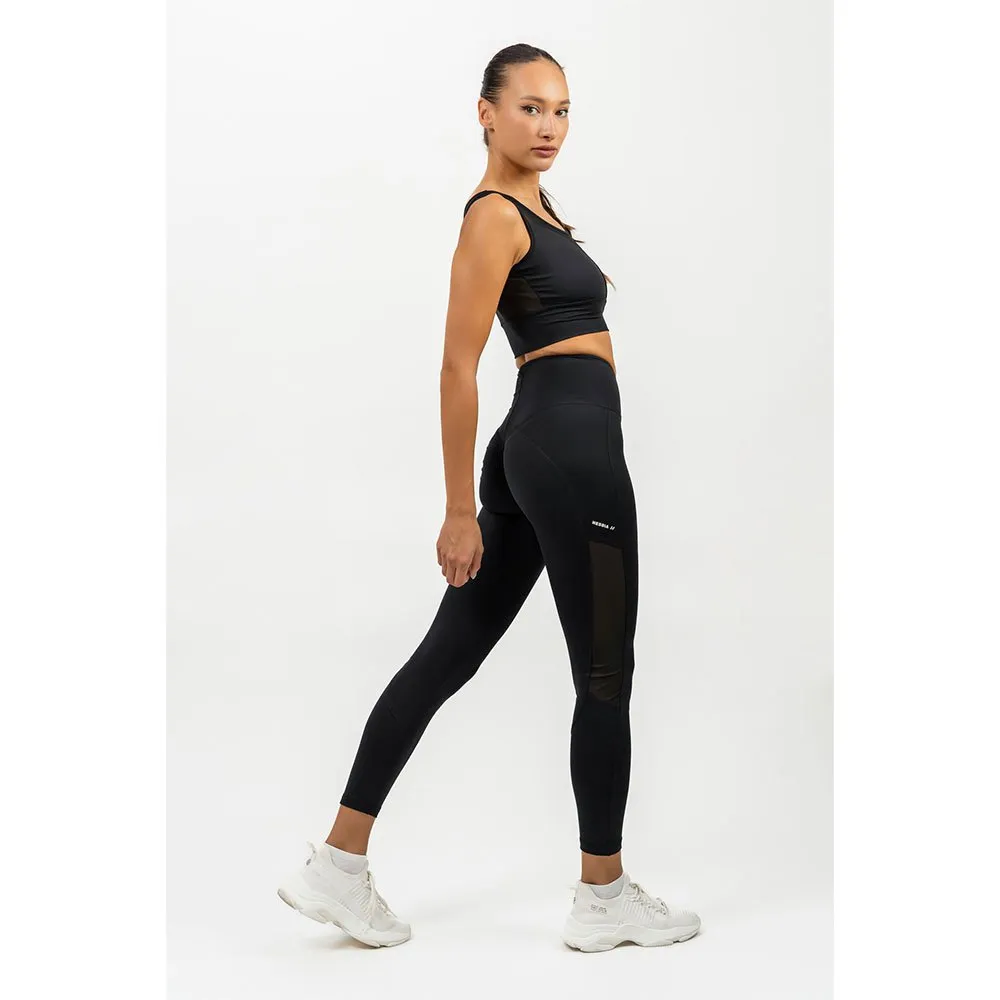 Эти женские сетчатые леггинсы имеют V-образную высокую талию, которая надежно удерживает леггинсы на месте.
