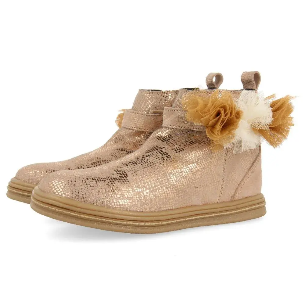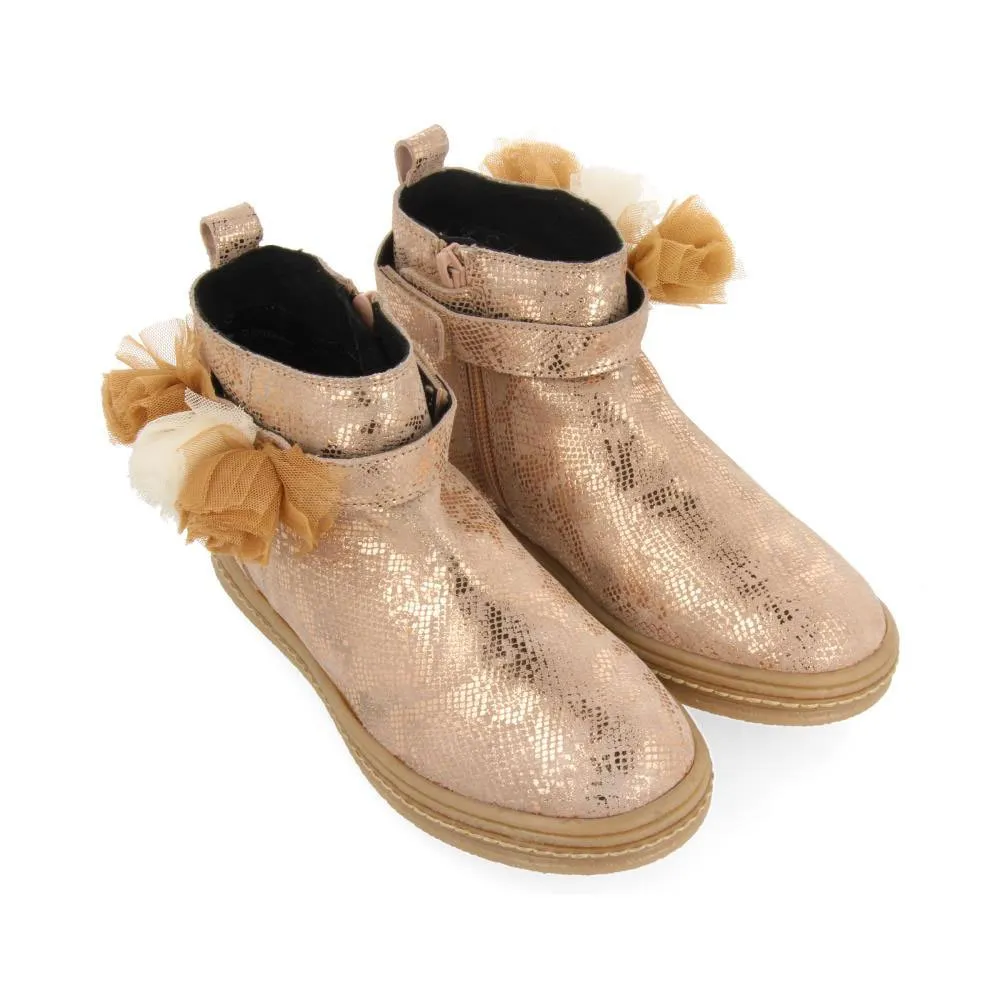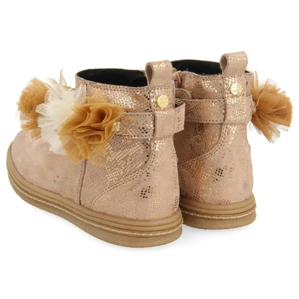 Ботинки из кожи розового золота с текстурой и цветочным декором.
