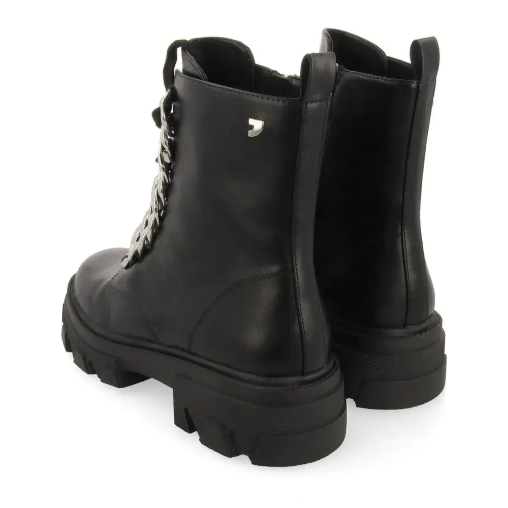Черные ботинки в стиле милитари на шнуровке с аппликацией из крупных цепей на щеках.