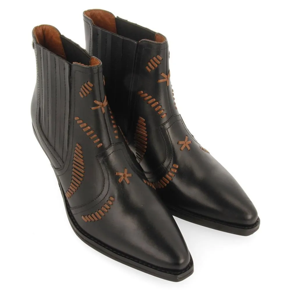 Черные кожаные сапоги в ковбойском стиле с вышивкой ручной работы коричневого цвета.