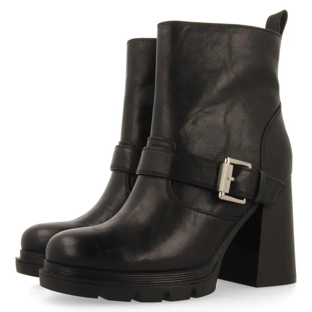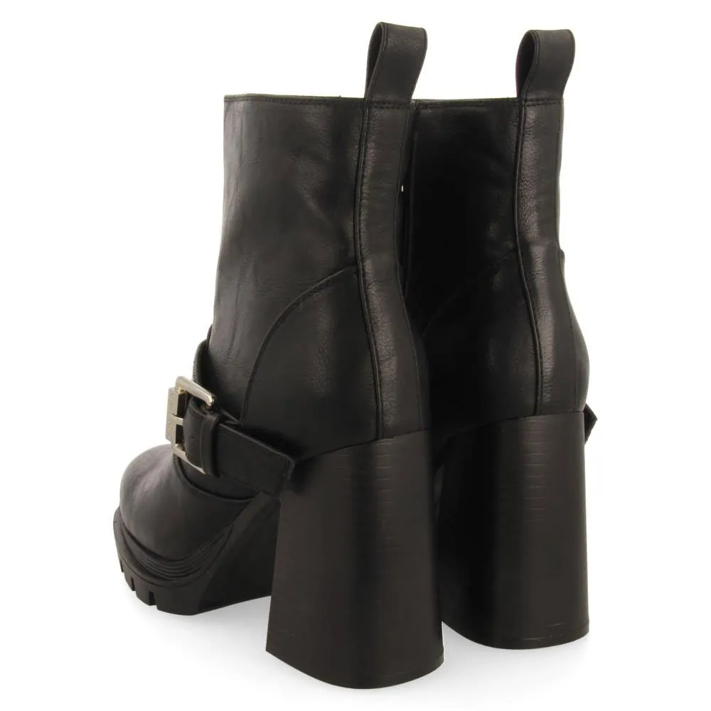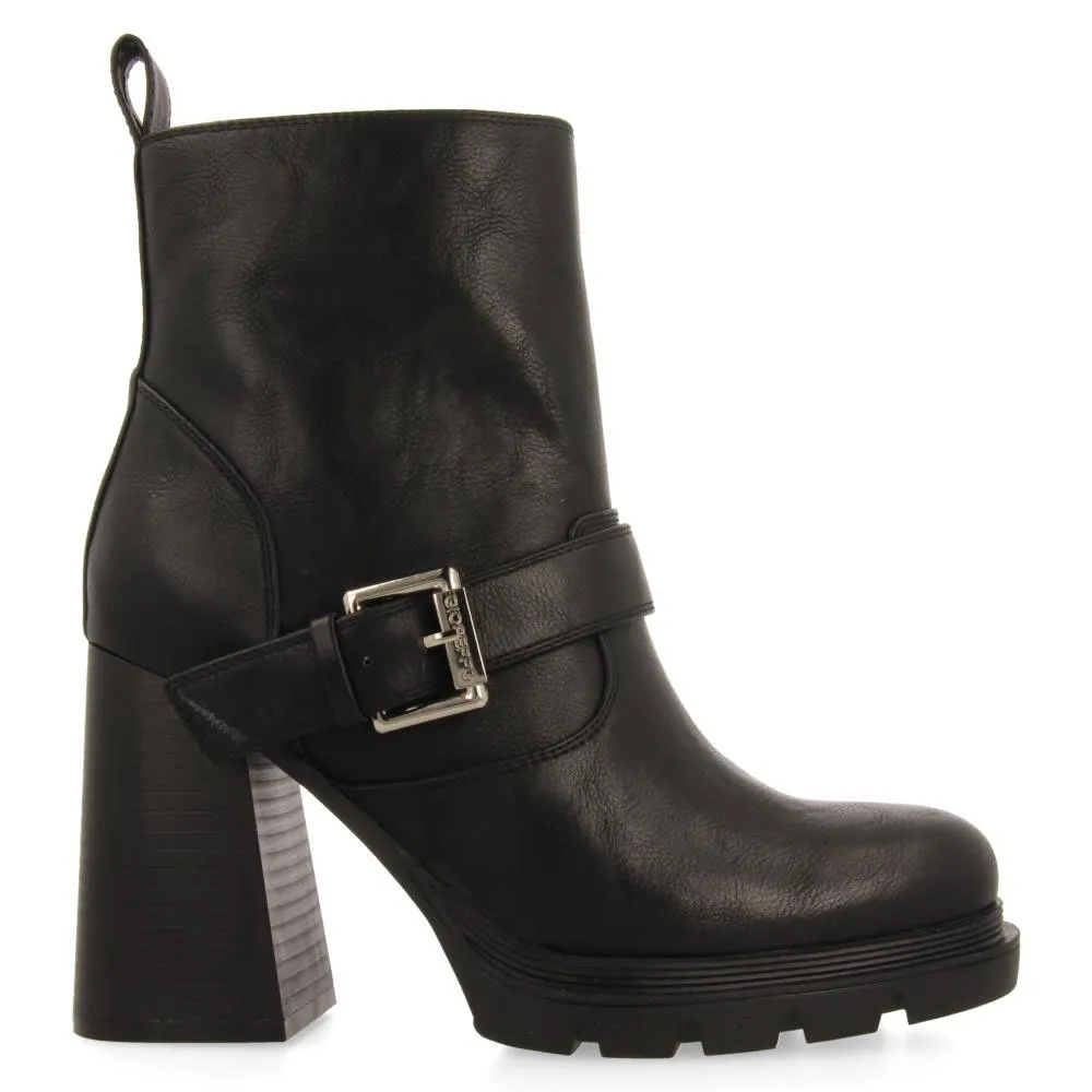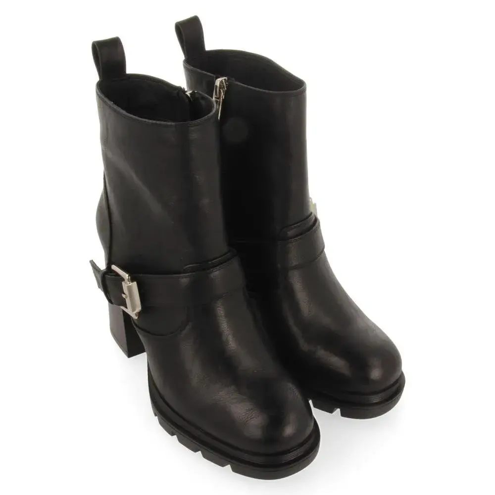 Черные ботинки в байкерском стиле с пряжками и каблуками.