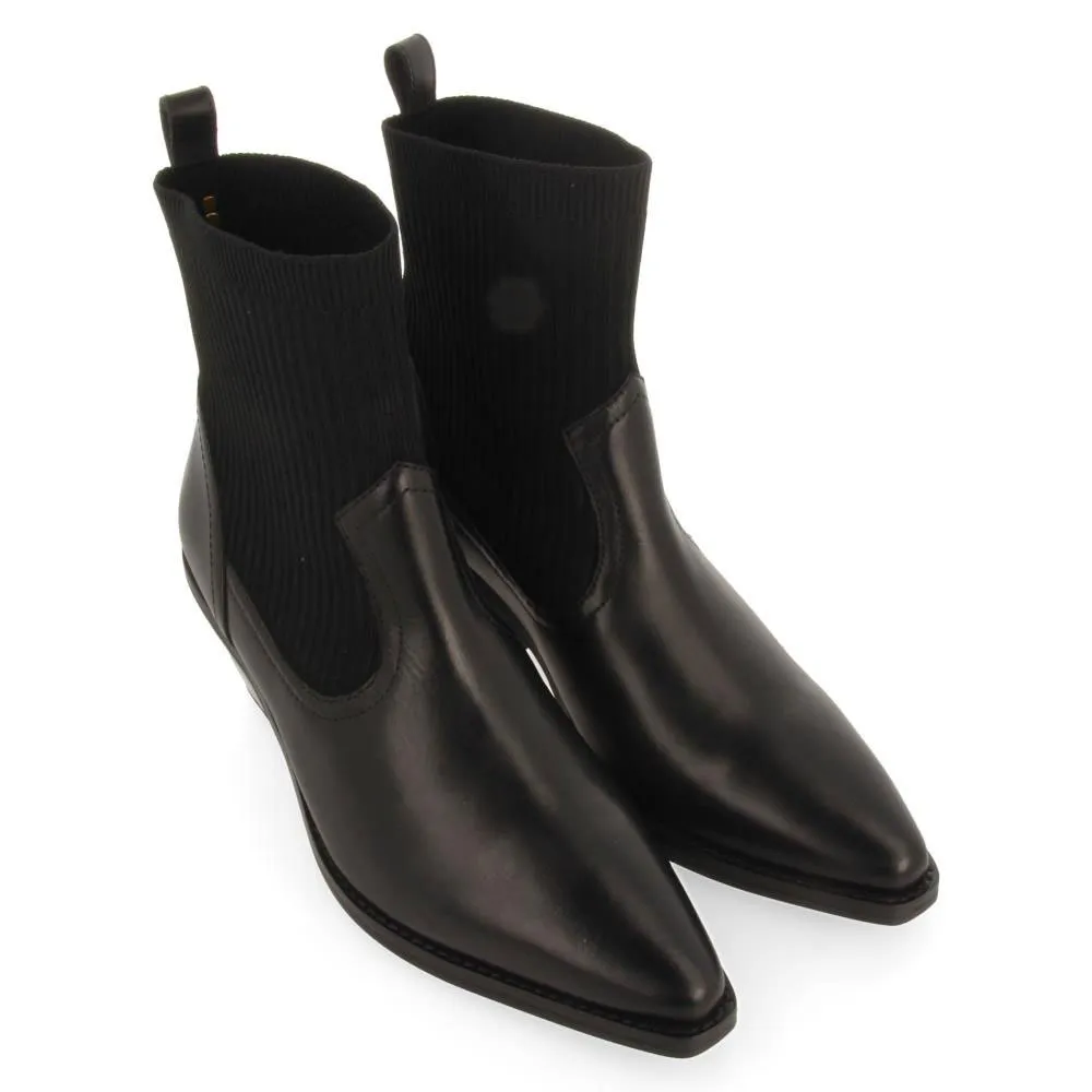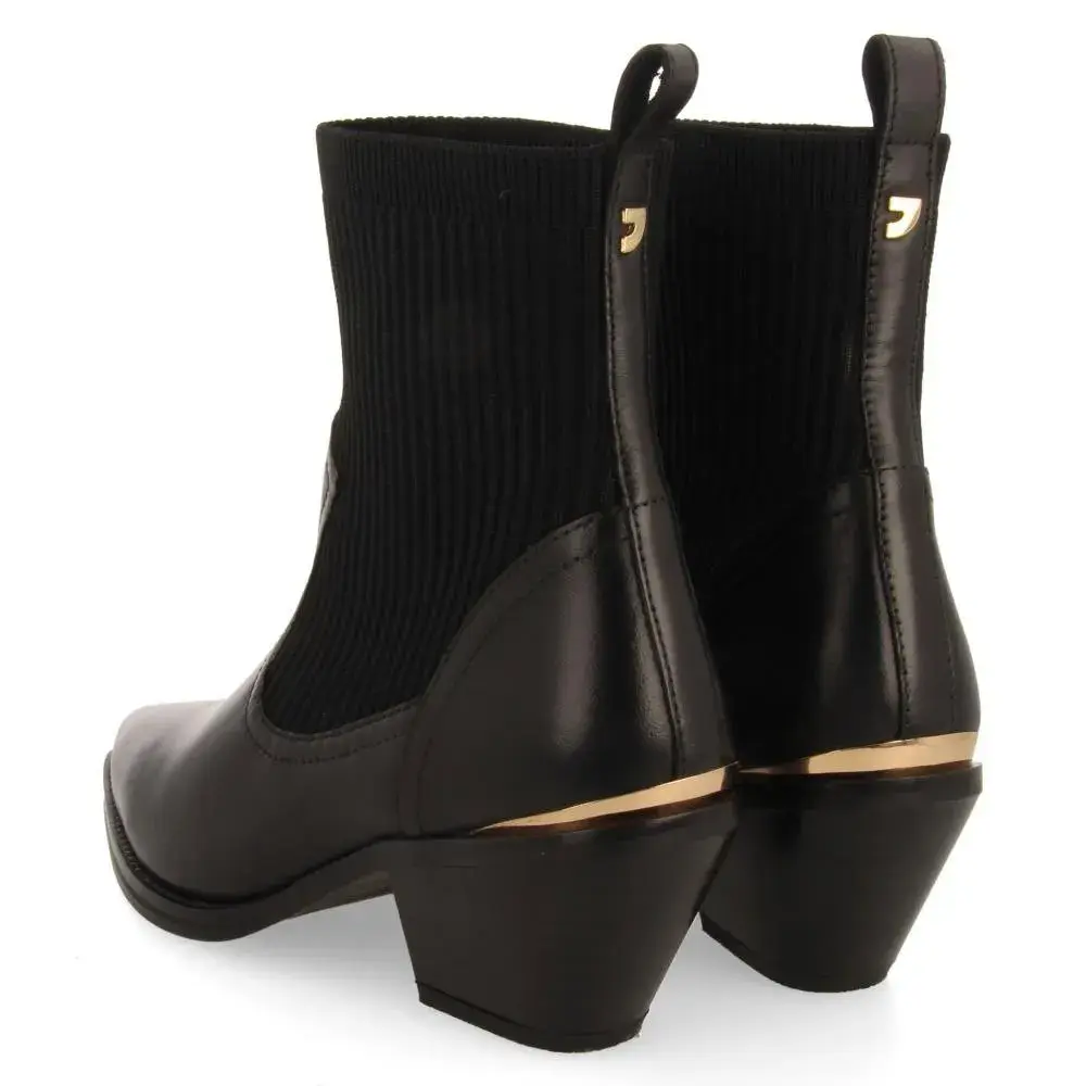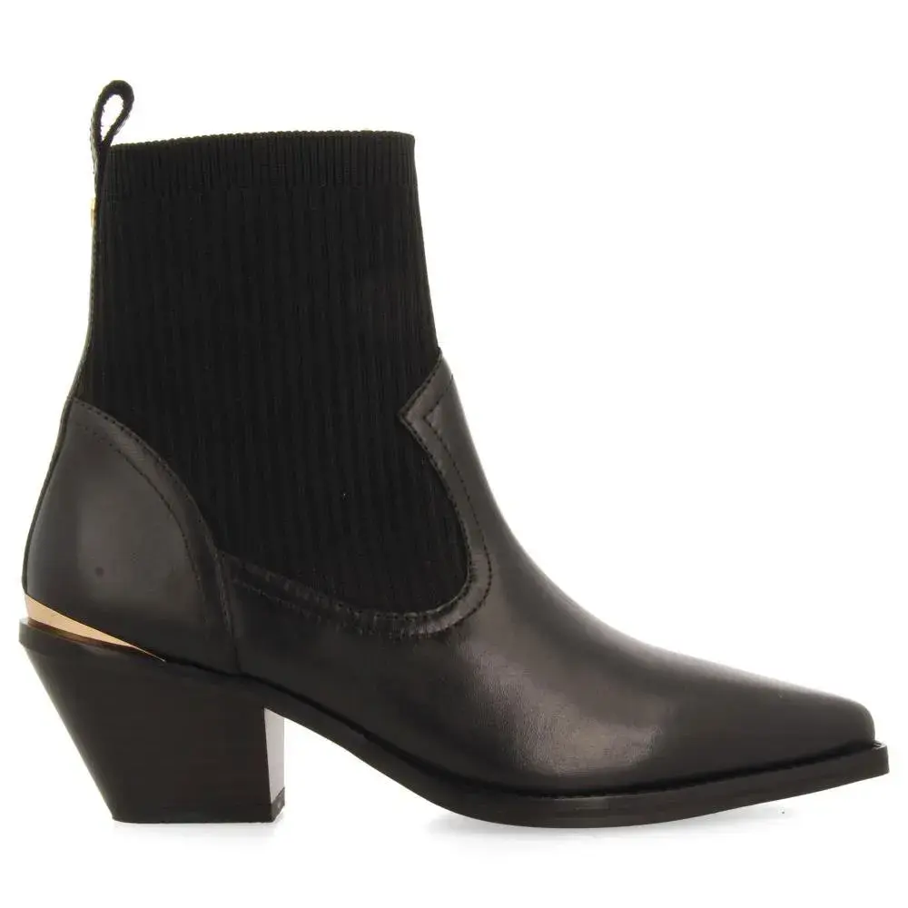 Черные кожаные сапоги в ковбойском стиле с каблуком, голенищем в виде носка и металлическими деталями.