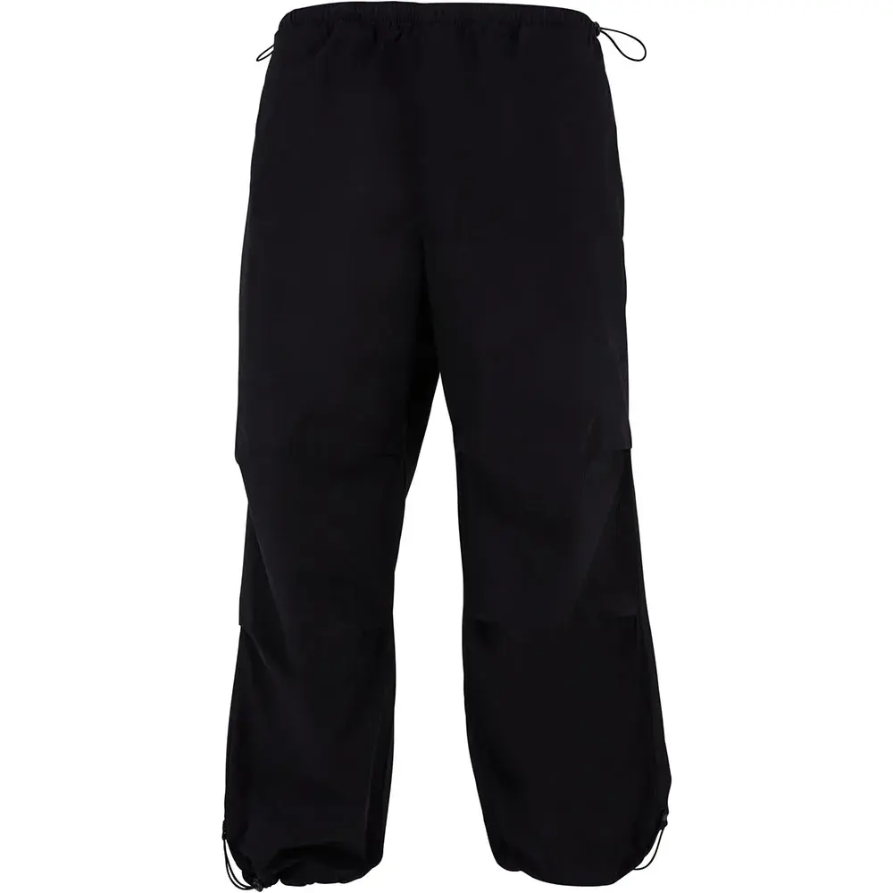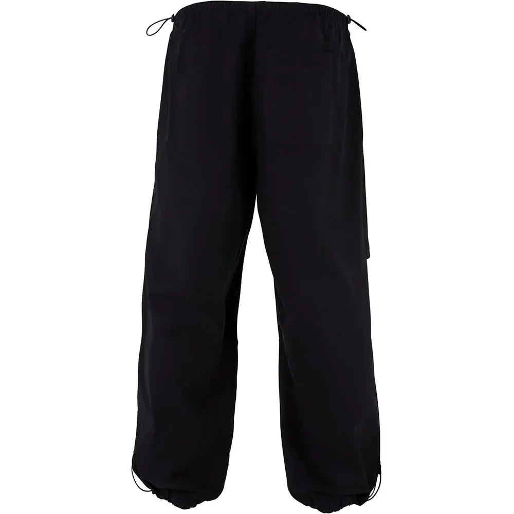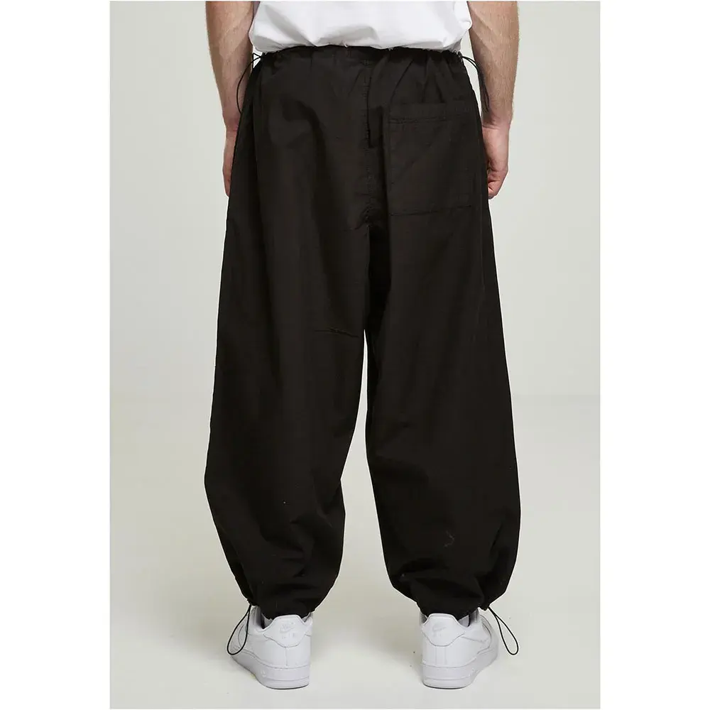 Мужские брюки-парашют отличаются широкими штанинами и завязками со стопорами на поясе и концах брючин, что также позволяет регулировать посадку. Они имеют прочный свободный крой. Накладной задний карман и два боковых кармана с ложными клапанами добавляют акцентов. Гульфик также пришит. Колено также имеет специальный подгиб для дополнительной ширины. Брюки-парашюты изготовлены из гладкой хлопковой поплиновой ткани.
