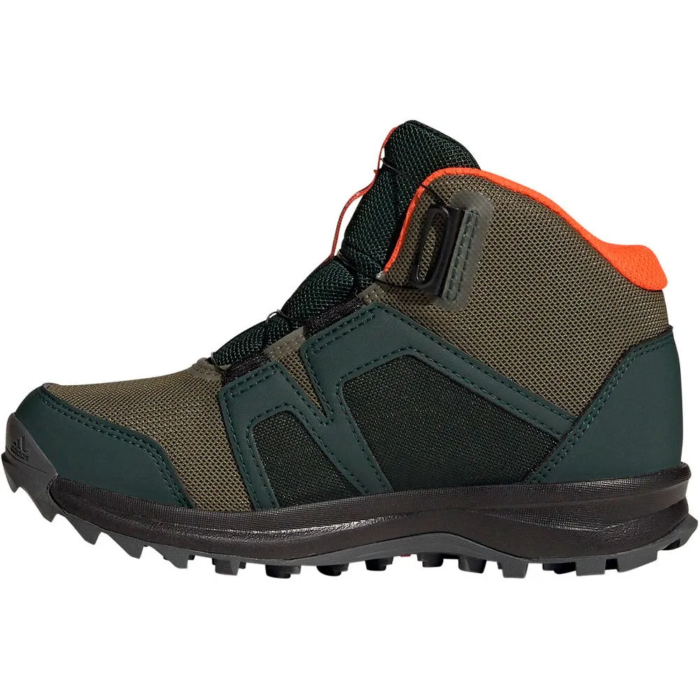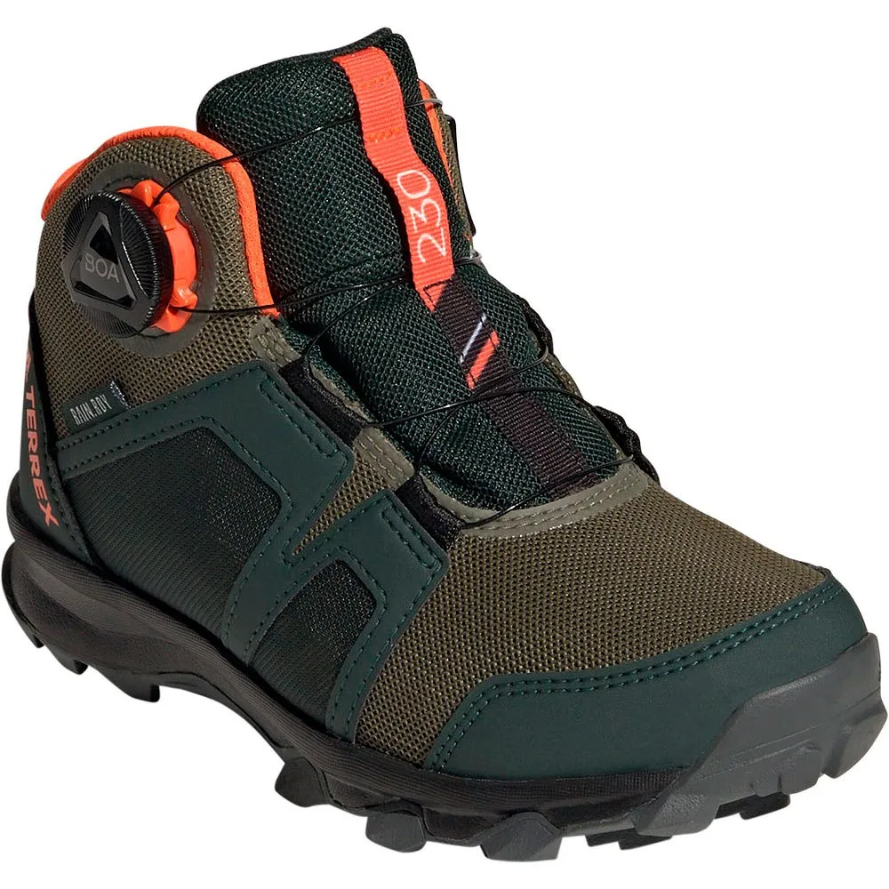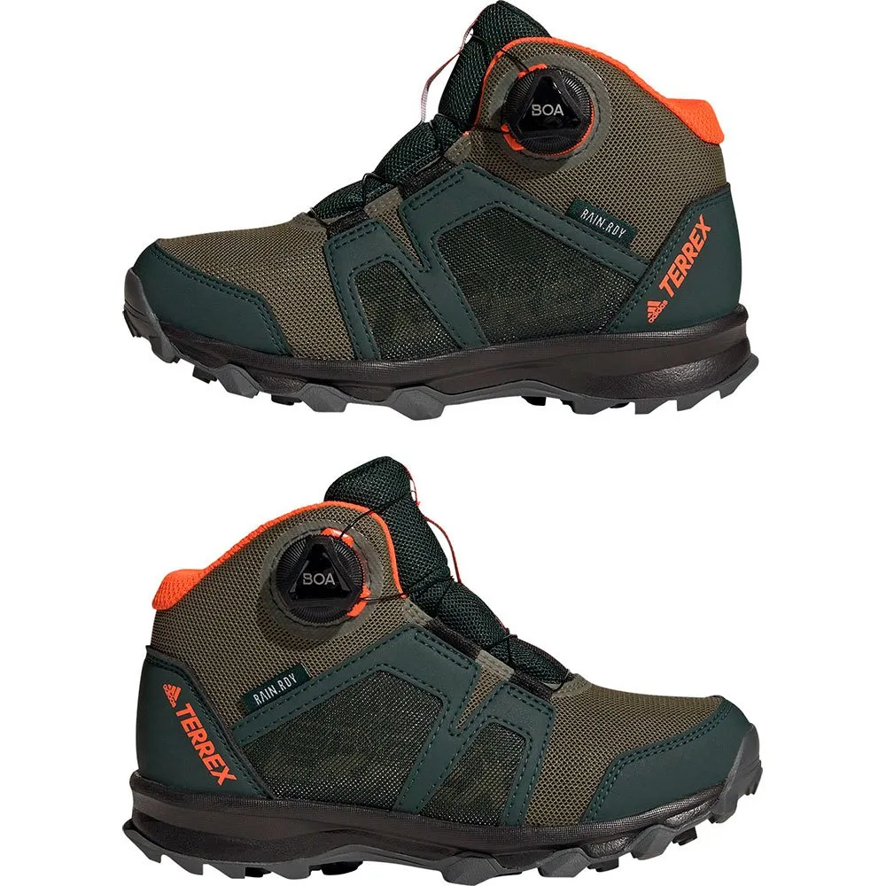 Влажно или сухо, высоко или низко, дети могут исследовать местность с уверенным сцеплением и сухими ногами в этих походных кроссовках adidas Terrex Boa Mid RAIN.RDY.