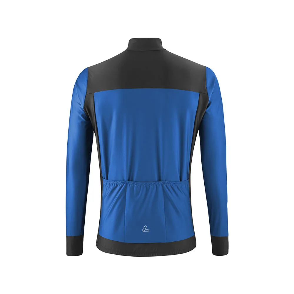 Утепляющий, высокоэластичный, быстросохнущий, шероховатая внутренняя часть, цветной блок, воротник-стойка с внутренней стороны из транстекса, молния по всей длине, длинный рукав с пришитыми манжетами, 3 открытых кармана сзади, эластичный край с силиконовой резинкой, светоотражатели.