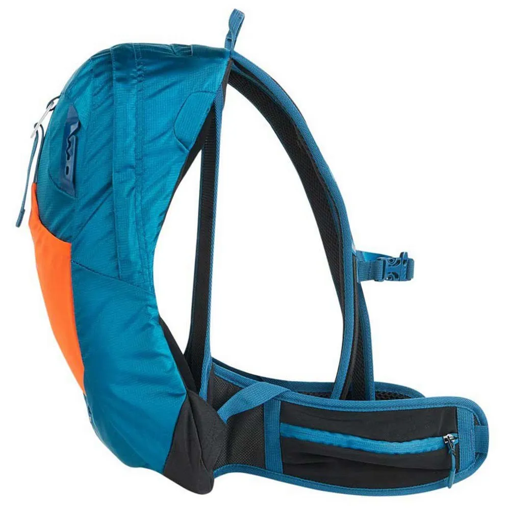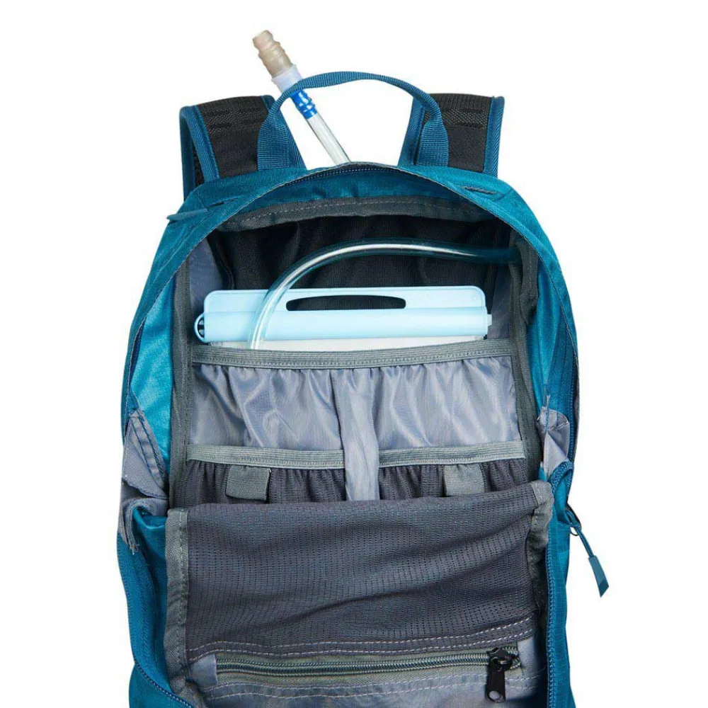 В его основном отделении есть отделение для сумки с питьем (не входит в комплект), сетчатый карман на молнии для документов и держателя ключей, а также 2 небольших сетчатых кармана с резинкой, например, для велосипедных инструментов. Он включает в себя элементы безопасности, такие как свисток на нагрудном ремне и яркий оранжевый дождевик в кармане у основания рюкзака.