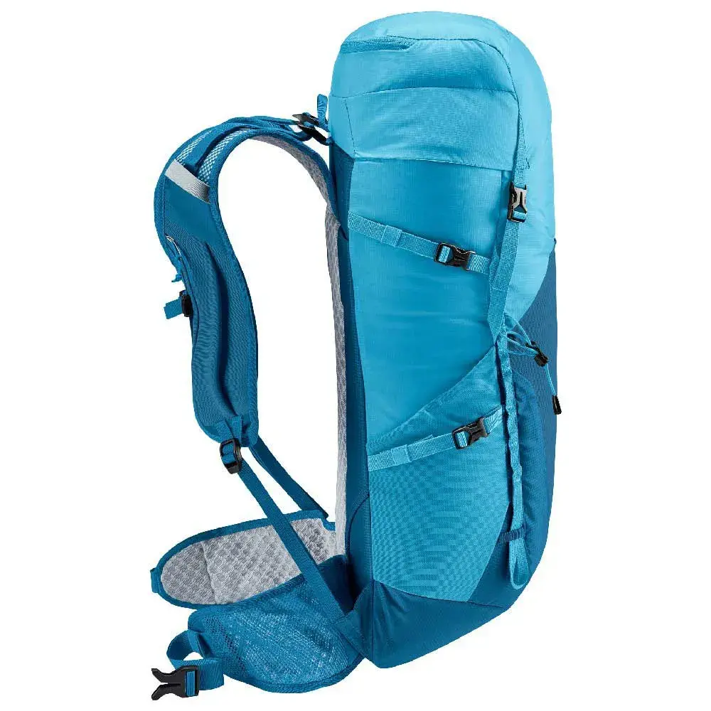 Скорость, лёгкость и экологичность благодаря системе спинки Deuter Lite, перфорированным плечевым ремням жилетного типа, мягким набедренным ремням, точно регулируемому нагрудному ремню и полностью переработанному, сертифицированному Bluesign материалу корпуса. Разработанный для быстрого пешего туризма и бега по пересечённой местности, рюкзак с боковыми компрессионными ремнями эффективно уменьшает смещение груза и обеспечивает полную свободу движений. В то время как карман на плечевых ремнях сохранит все необходимое для похода, а более крупные предметы можно спрятать во вместительном кармане в крышке.