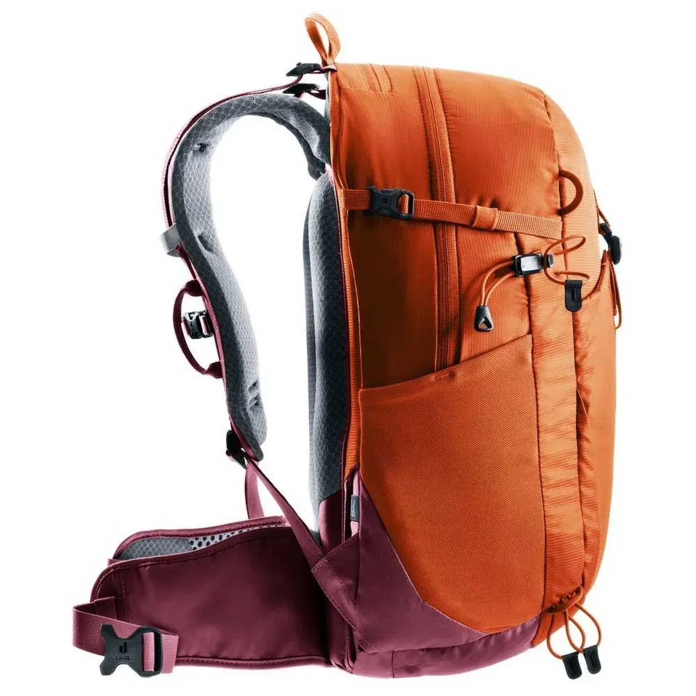 Уменьшенная площадь соприкосновения и большие вентиляционные каналы спинной системы Deuter Airstripes в сочетании с перфорированными плечевыми ремнями и набедренными ремешками обеспечивают максимальный воздушный поток и равномерное распределение веса, обеспечивая плотную и надежную посадку на любой местности. Петли на плечевых ремнях позволяют держать карабины Via Ferrata Set под рукой. А благодаря большой передней молнии, переднему карману для хранения и боковым карманам, снаряжение и экипировка всегда будут под рукой.