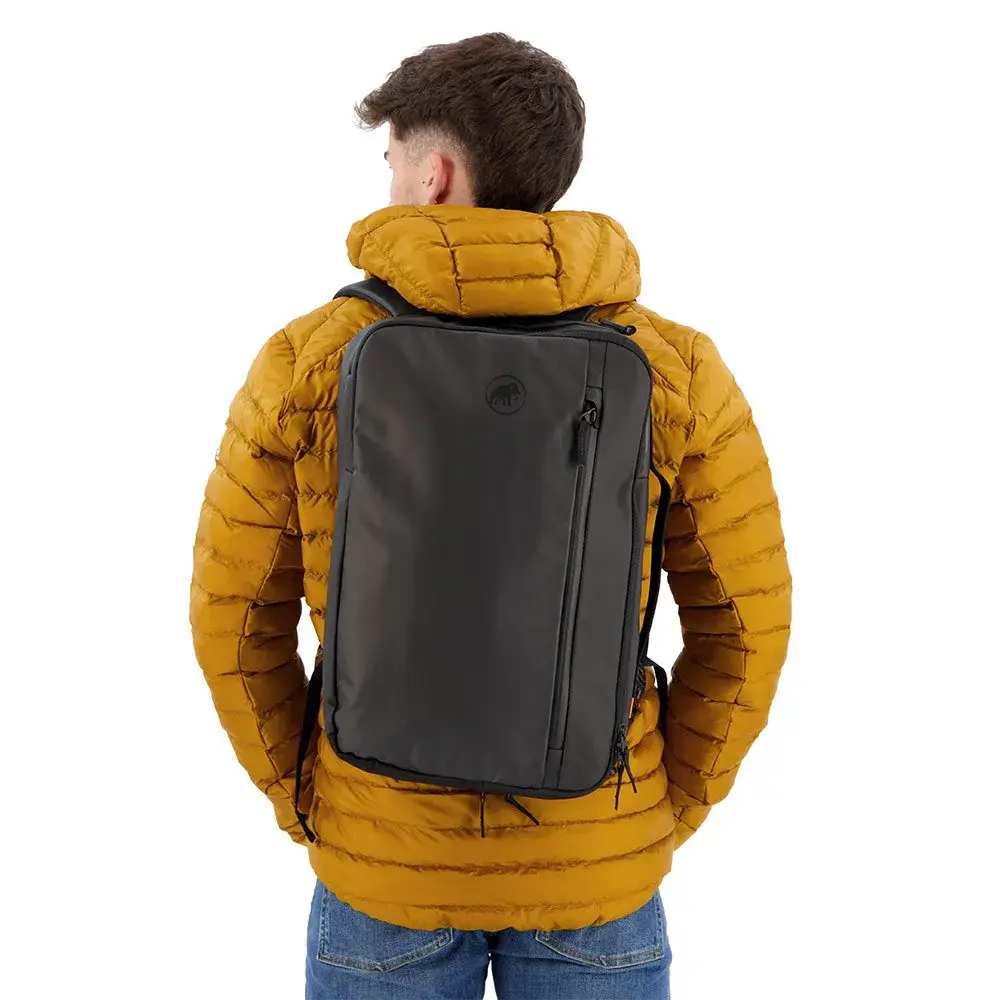 Вдохновленные активным образом жизни Mammut, рюкзаки линейки Seon созданы для того, чтобы совмещать работу и отдых: они включают в себя специальное отделение «для работы» для ноутбука, планшета или документов, а также отделение «для скалолазания» для спортивного инвентаря. Вы сможете оставаться мобильными и наслаждаться свободным временем. Seon 3-Way — настоящий универсал. Городской рюкзак для повседневной жизни в городе, который также можно носить через плечо. Стильный и практичный спутник для коротких деловых поездок: ваши ценные вещи надежно хранятся в отделении на молнии, а практичная петля позволяет прикрепить рюкзак к чемодану на колесиках. И, конечно же, ваше спортивное снаряжение будет с вами в отдельном отделении «для скалолазания».