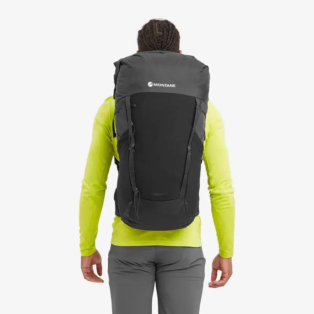 Этот лёгкий, но прочный рюкзак имеет изогнутый алюминиевый каркас для стабилизации тяжёлых грузов и совместим с питьевой системой. Он оснащен удобными для доступа отделениями для хранения, включая большой сетчатый передний карман на молнии и сетчатые боковые карманы, а модульная система Montane T-Hook адаптируется к вашим индивидуальным потребностям для удобного хранения треккинговых палок, запасных слоев одежды и многого другого.