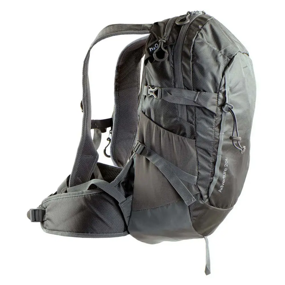 Обвязка с грудными и поясничными ремнями, поясной ремень с карманом, два эластичных боковых кармана, один передний карман, один внутренний карман для очков, два внутренних отделения.