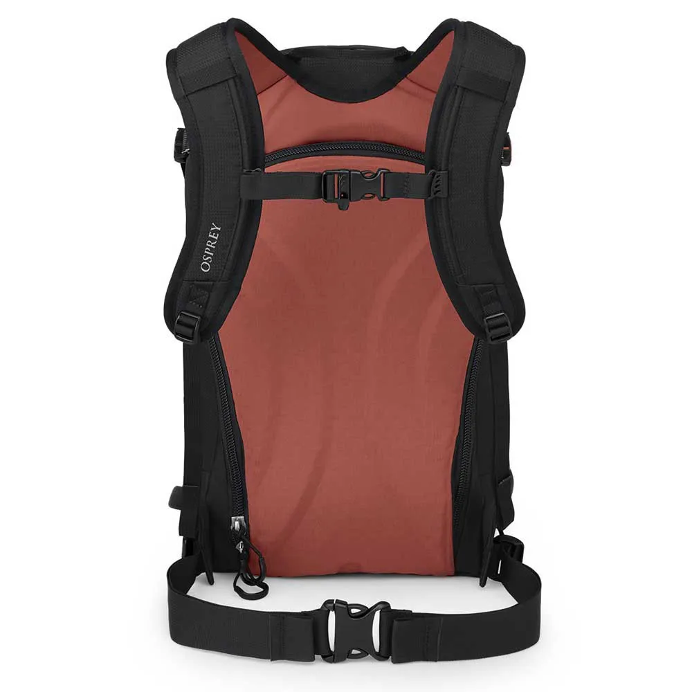 - Большая передняя панель с J-образной застежкой-молнией, доступной к карману для лавинного набора с ручкой лопаты и рукавами для щупов