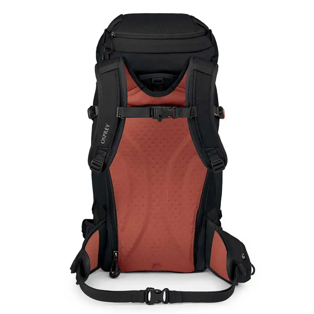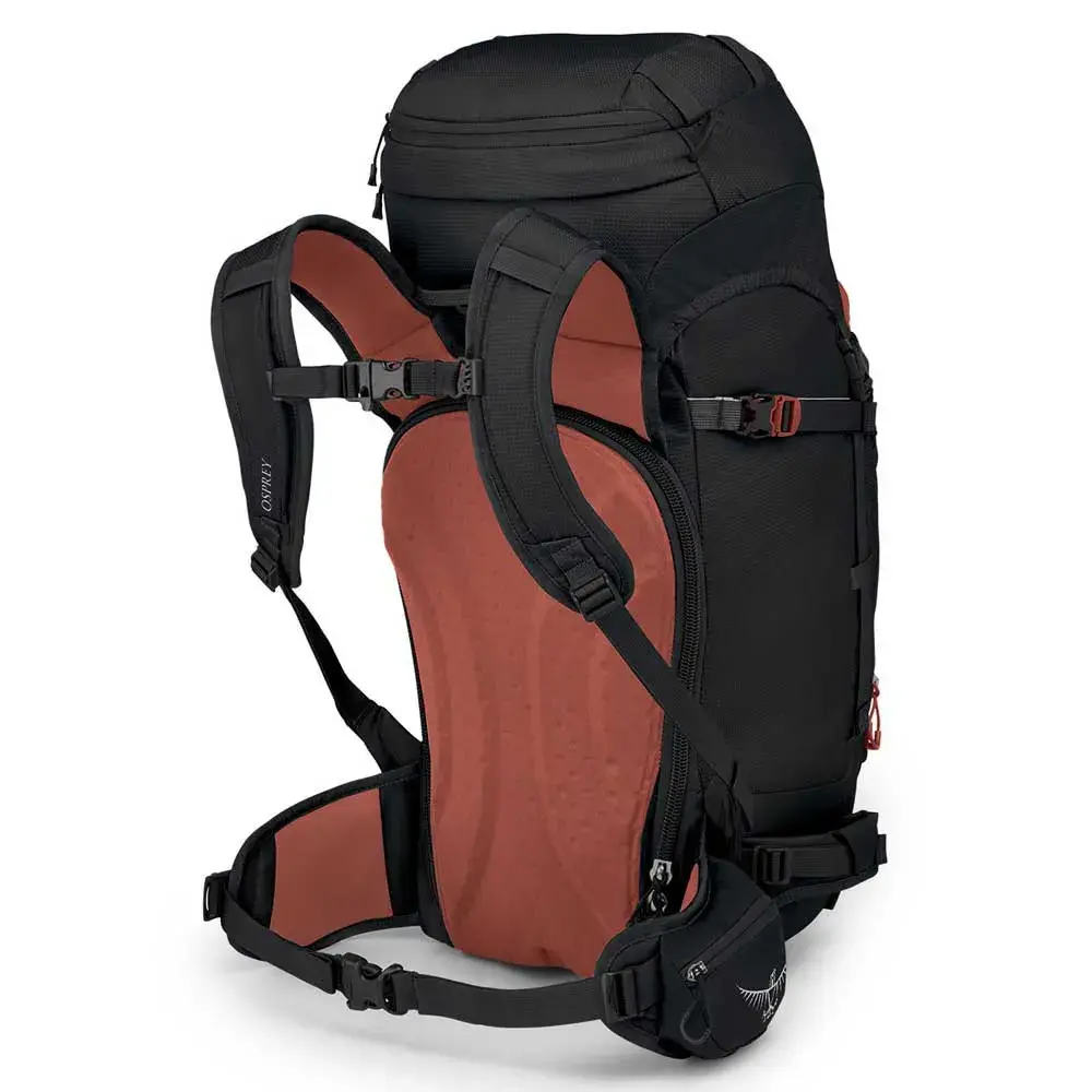 - Большая передняя панель с J-образной застежкой-молнией для доступа к карману для лавинного набора с ручкой лопаты и рукавами для щупов