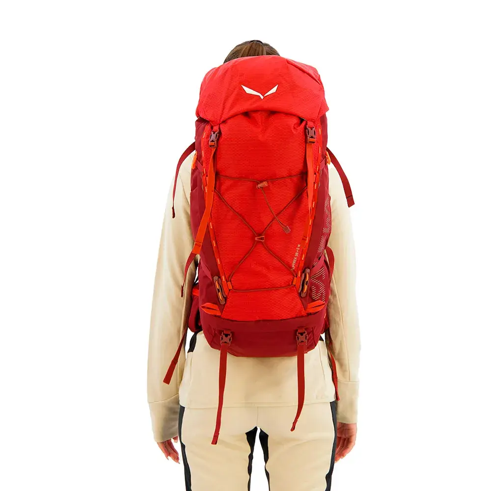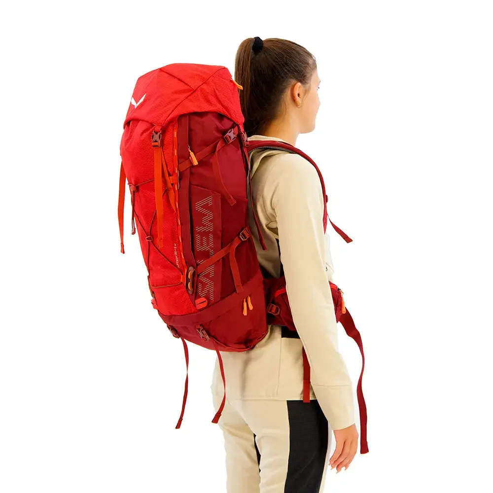 Удобная переноска тяжелых грузов. Женский удобный, полностью регулируемый рюкзак объемом 38 литров для многодневных горных походов с возможностью расширения на 5 литров. Катиначчо и Латемар, Сорапис и Мармароле или группа Селла... Доломиты - самый красочный и сложный горный хребет для сквозных походов и треккинга в Европе. Разработанный для использования на большие расстояния, рюкзак Alptrek 38 - это удобный треккинговый рюкзак из легкого, очень износостойкого нейлона с полностью регулируемой системой переноски и объемом 38 литров, а также возможностью добавления дополнительных пяти литров объема с помощью регулируемого по высоте отсека в крышке, который можно отсоединить для использования отдельно как сумка с помощью внутреннего ремня. Наша легко регулируемая система переноски Dry Back Custom имеет регулируемую длину спинки, а также анатомические мягкие плечевые ремни и поясной ремень для индивидуальной посадки, подходящей именно женщинам. Кроме того, ремни для подъема груза обеспечивают оптимальную посадку на спине на длинных дистанциях, в то время как предварительно сформированный поясной ремень гарантирует плотную посадку и хорошее распределение нагрузки на бедра. Большие карманы для хранения предоставляют достаточно места для запасной одежды или стоек для палатки, а двойной (спереди и сверху) доступ к основному отделению для быстрого и легкого извлечения снаряжения. А для быстрого доступа к важным вещам в пути дорожные карманы легко доступны, не снимая рюкзак со спины. С выходом для питьевой системы, креплением для ледоруба / треккинговых палок, веревочной застежкой, контролем нагрузки и боковыми компрессионными ремнями. Этот рюкзак также совместим с держателем для фляги Salewa. Другие особенности включают в себя: дождевик, практичную съемную резинку для крепления дополнительного снаряжения и нижние ремни для крепления вашего спального коврика. Наш легкий женский рюкзак Alptrek объемом 38 литров обеспечивает высокий комфорт при переноске и эффективную вентиляцию для многодневных горных походов.