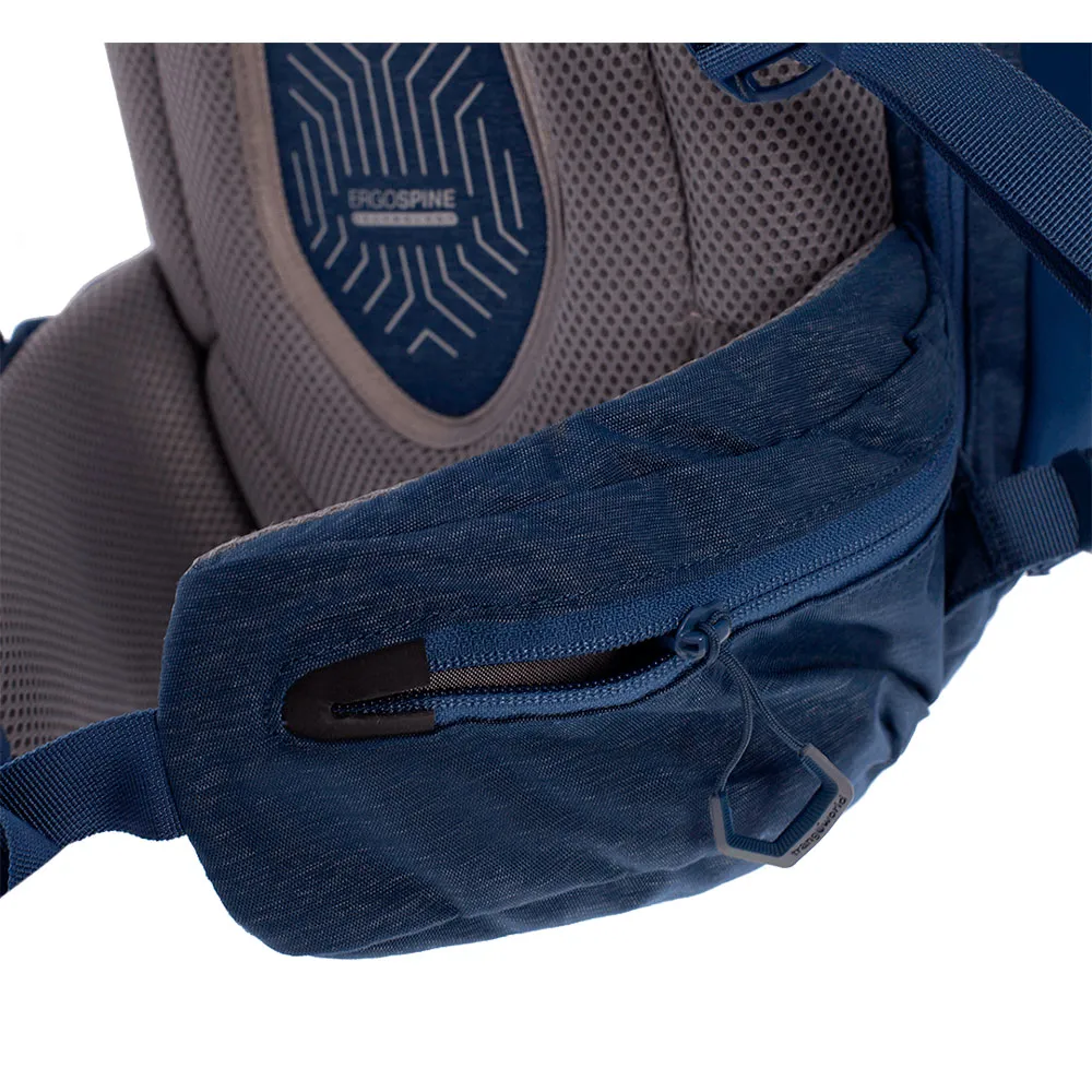 Он включает в себя эргономичные лямки с нагрудным ремнем, дышащую спинку со стержнем, стабилизирующим груз, поясничный ремень, компрессионные ремни, лямки для переноски альпинистского снаряжения, а также несколько внутренних и внешних карманов для организации мелких вещей внутри этого горного рюкзака.