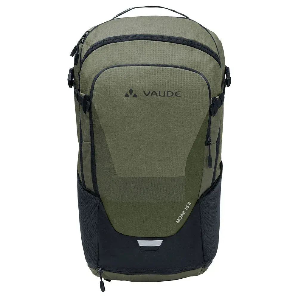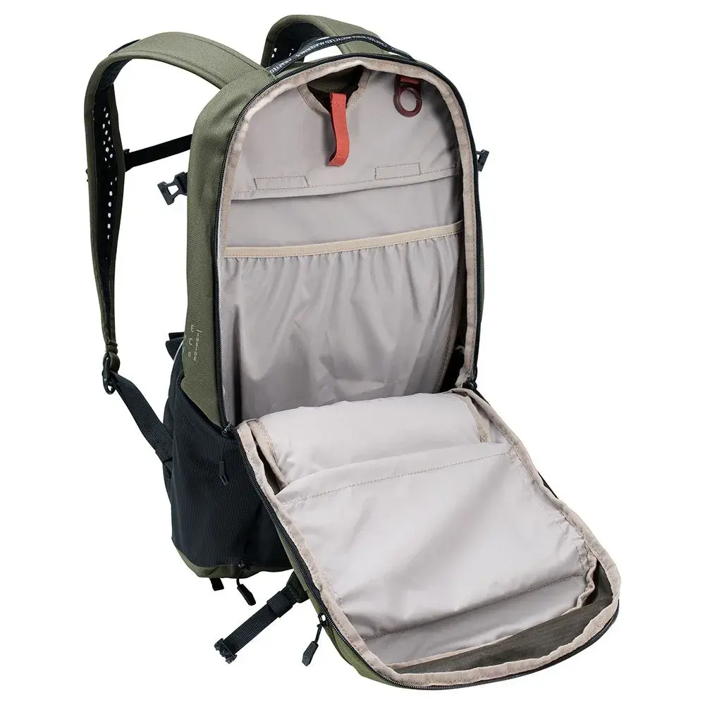 Особенности включают в себя боковые эластичные карманы, отдельное отделение для питьевой системы, компрессионные ремни по бокам, петлю на ремешке для солнцезащитных очков, дождевик в отдельном нижнем отделении и светоотражающие элементы для большей безопасности в темноте.