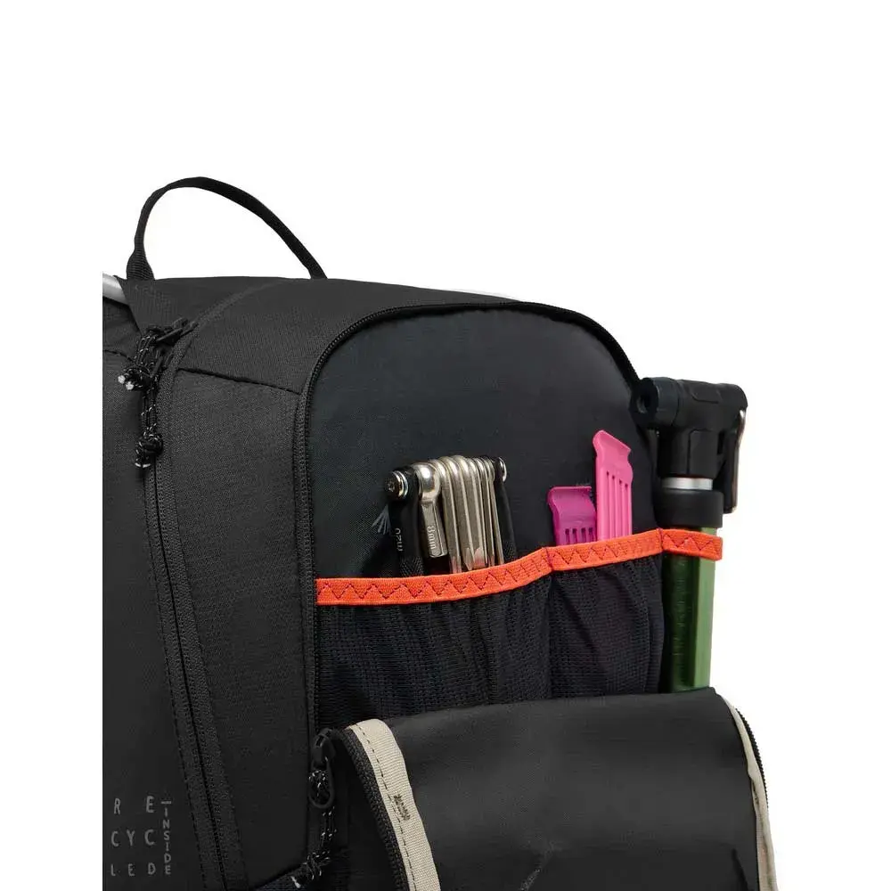 Храните насос, инструменты и запасную трубку в переднем кармане, а боковые сетчатые карманы позволят вам легко достать перчатки, гели или батончики.