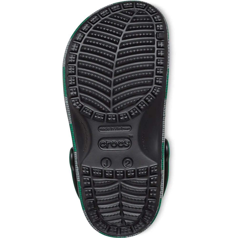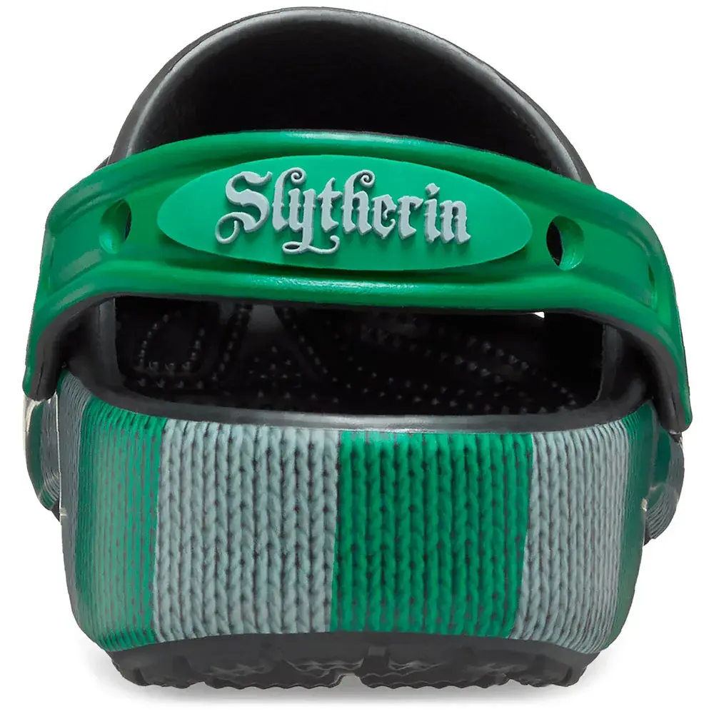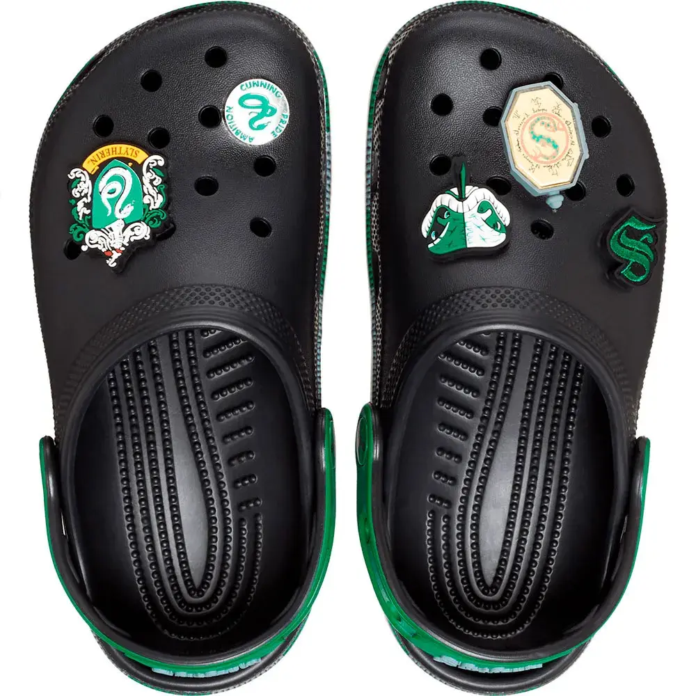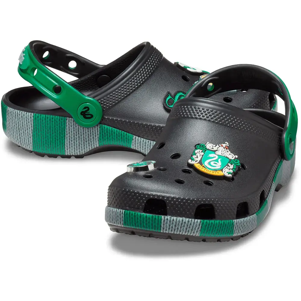 Помогите им проявить себя в стиле Слизерина в классических сабо с подошвой, напечатанной в стиле зелено-серебристого шарфа факультета, а также с эксклюзивными подвесками Jibbitz.