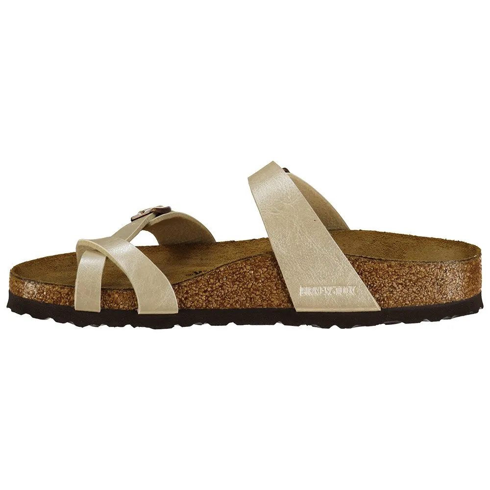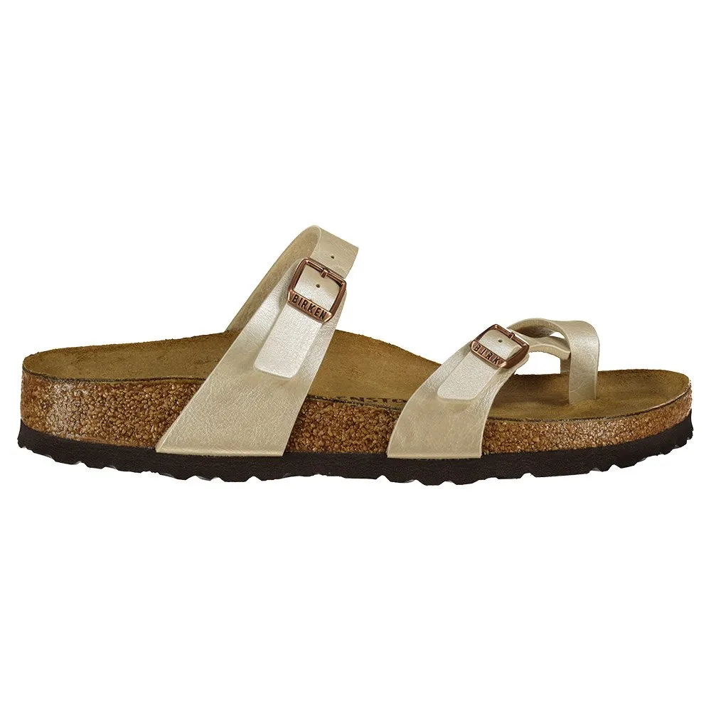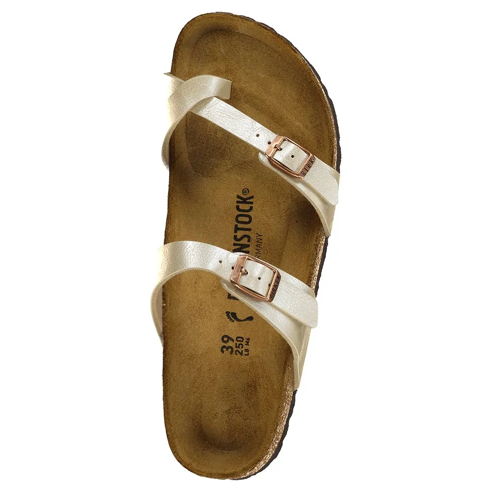 Практичные сандалии Birkenstock Mayari с двумя ремешками, каждый с металлической пряжкой с индивидуальной регулировкой, накладка на палец с атласным блеском.