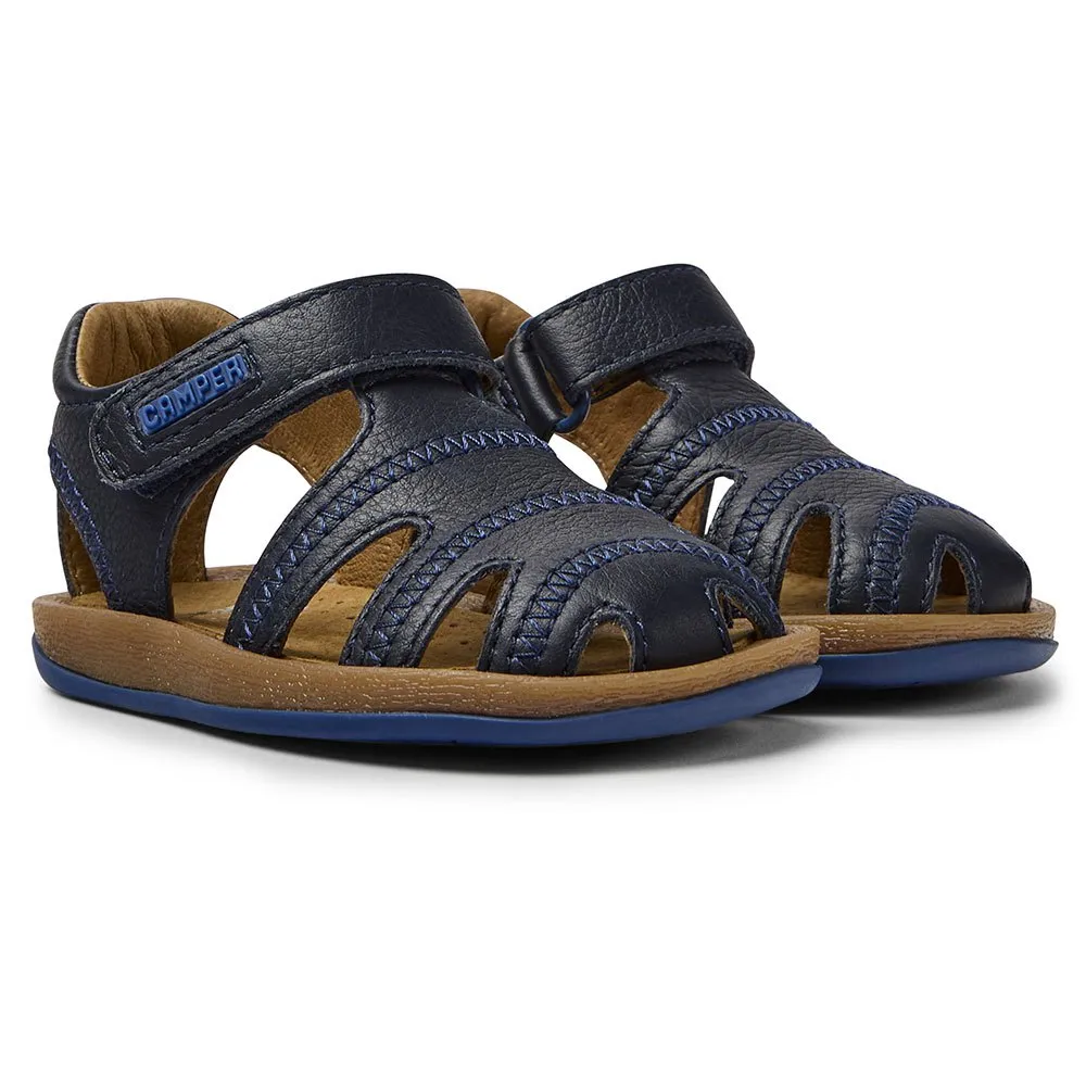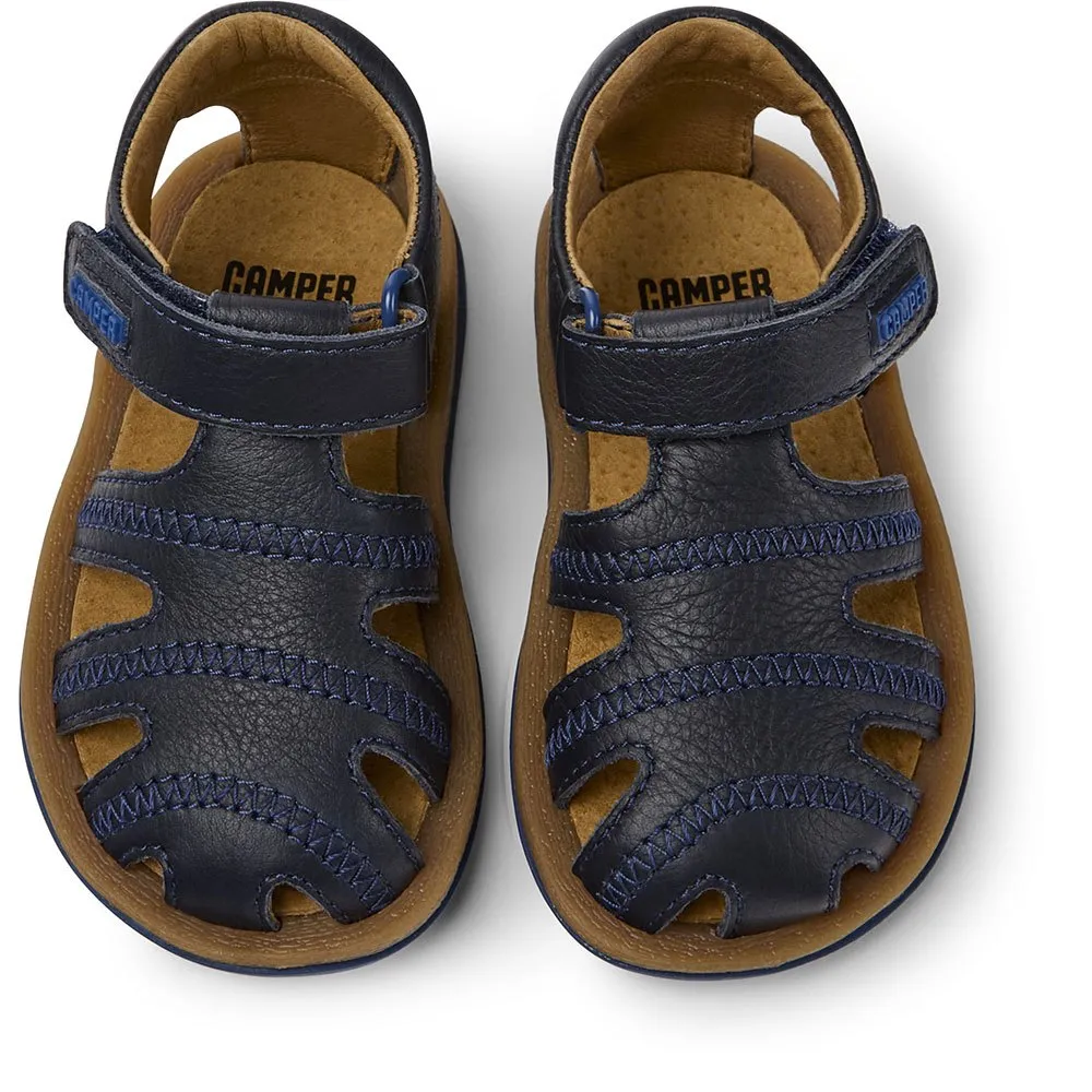 Сандалии детские из синей кожи с застежкой на липучке и подошвой из 100% резины (из переработанного сырья на 20%).