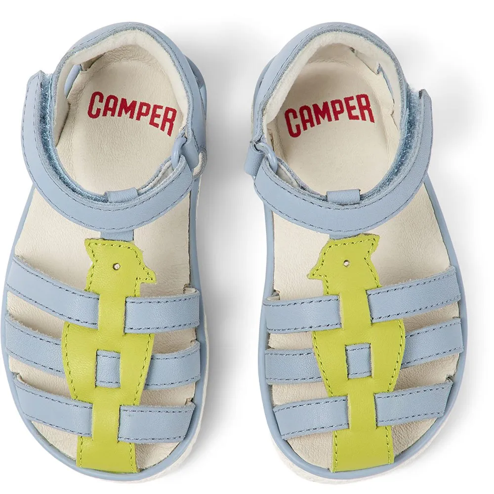 Детские сандалии из синей и зеленой кожи с изображением попугая, застежкой на липучке и резиновой подошвой.