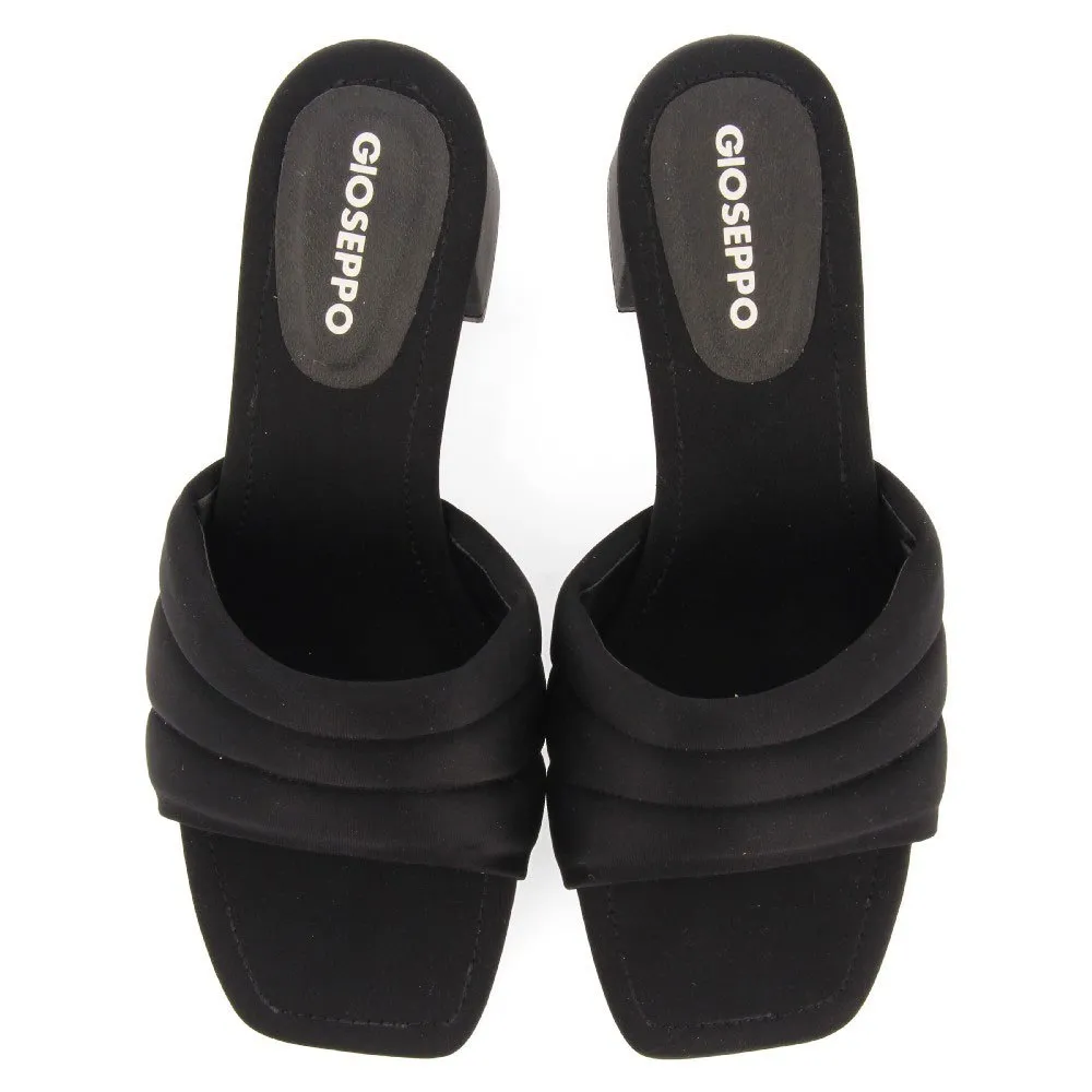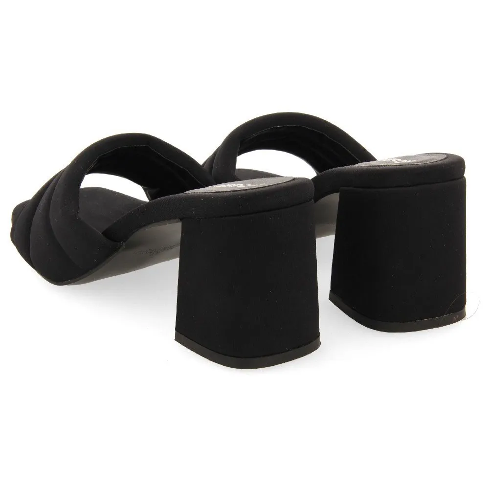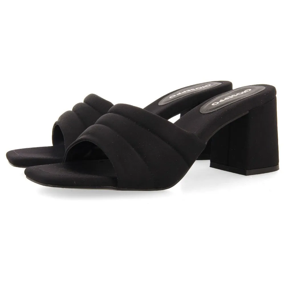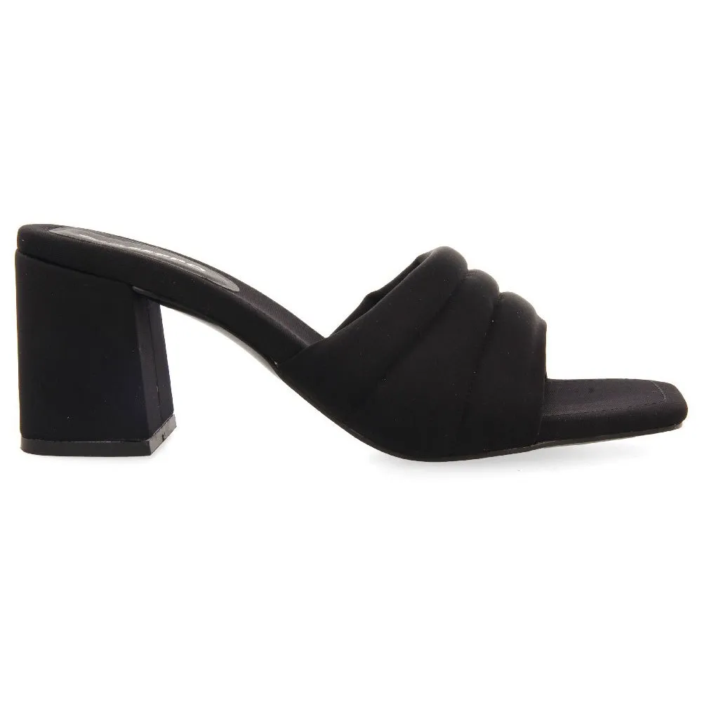 Взгляните на них! Черные босоножки на каблуке с открытой пяткой и мягким верхом.