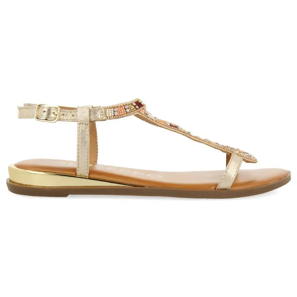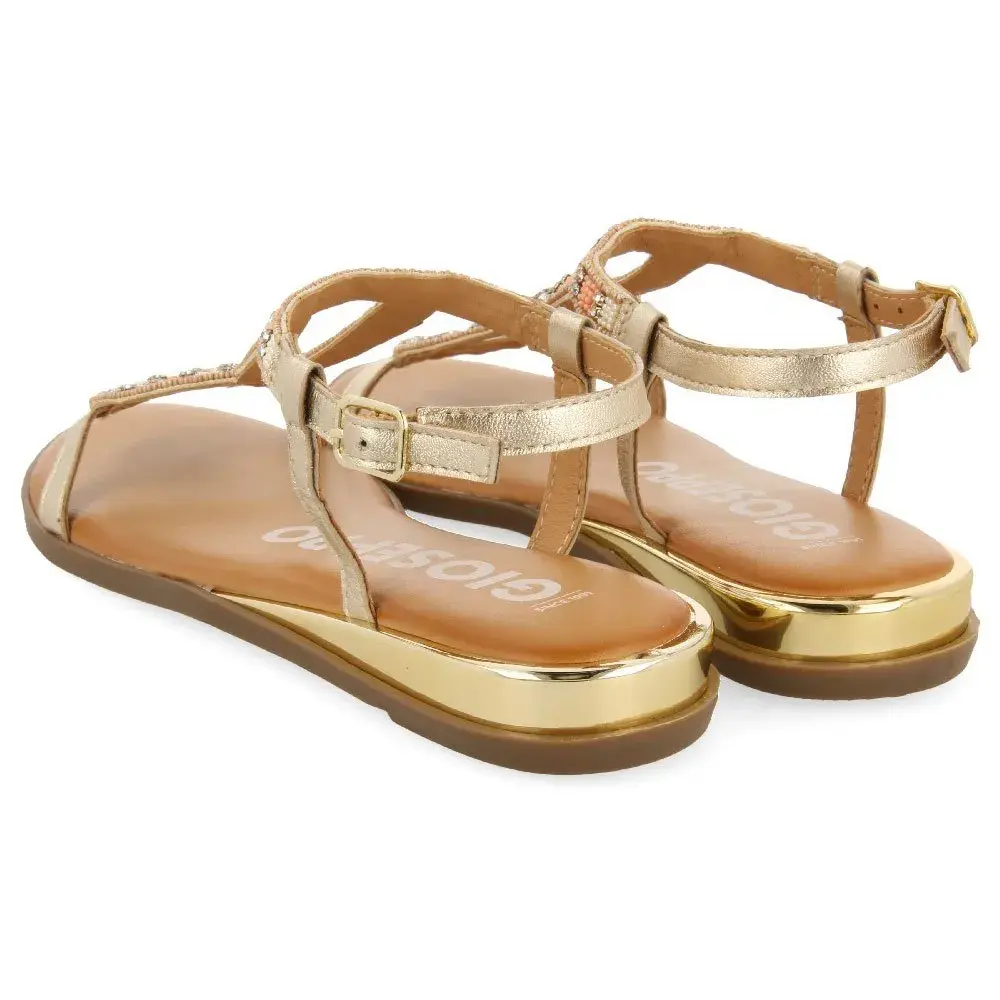 Насыщенный цвет! Золотистые босоножки с разноцветными камнями и регулируемой пряжкой.