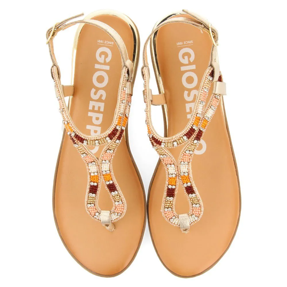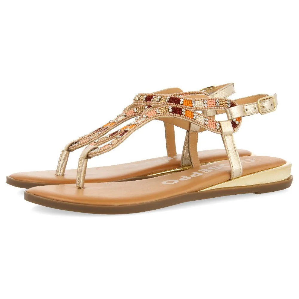 Насыщенный цвет! Золотистые босоножки с разноцветными камнями и регулируемой пряжкой.
