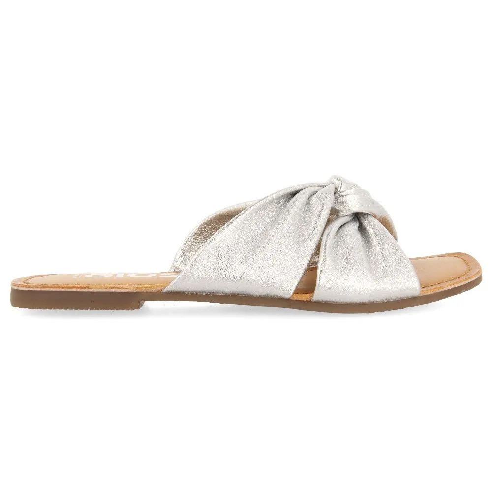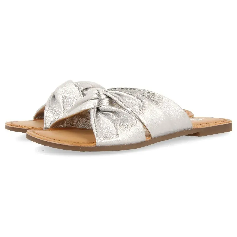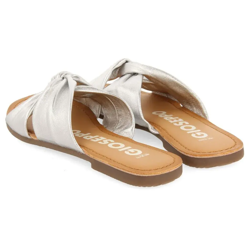 Серебристые кожаные сандалии-лопатки с перекрещивающимися носками.
