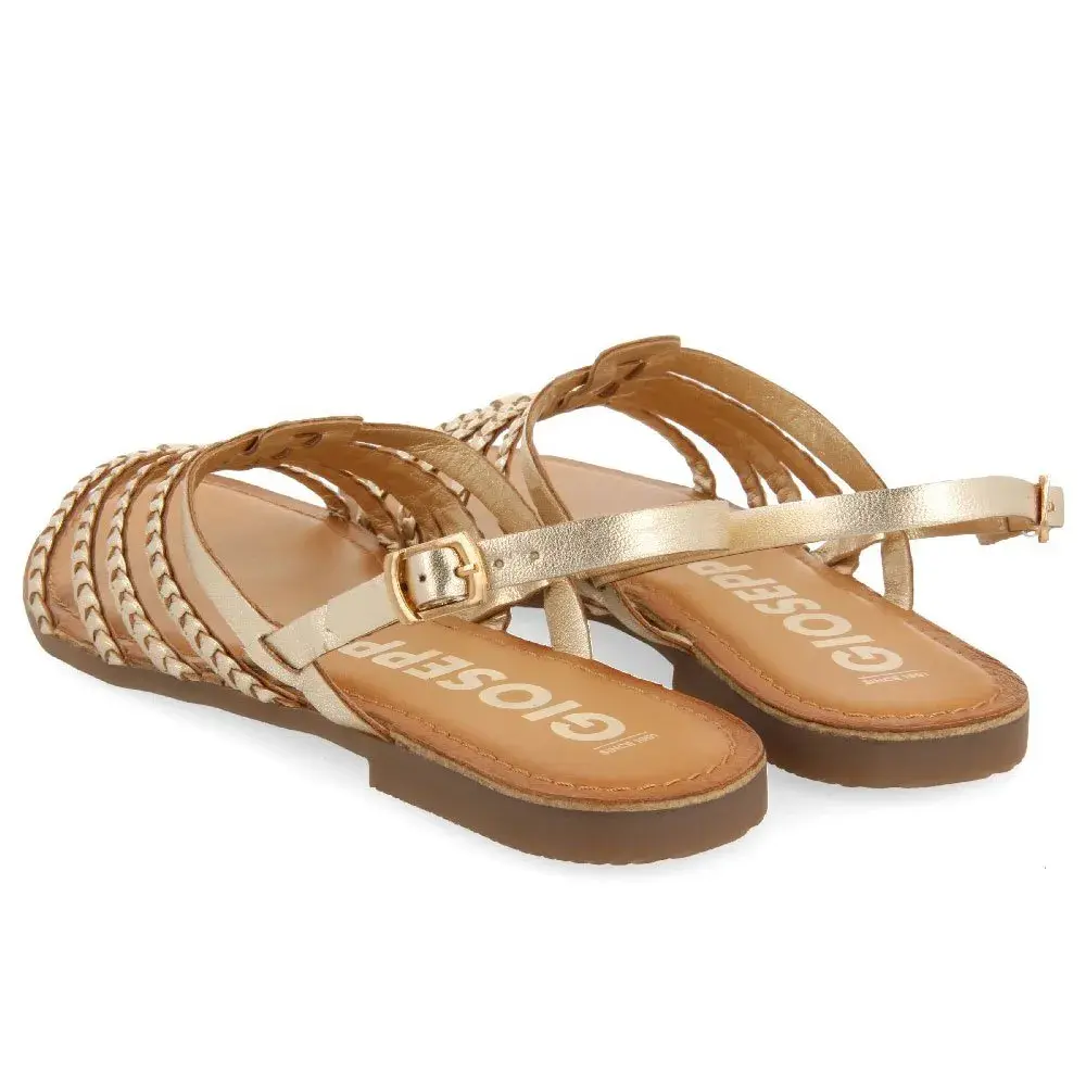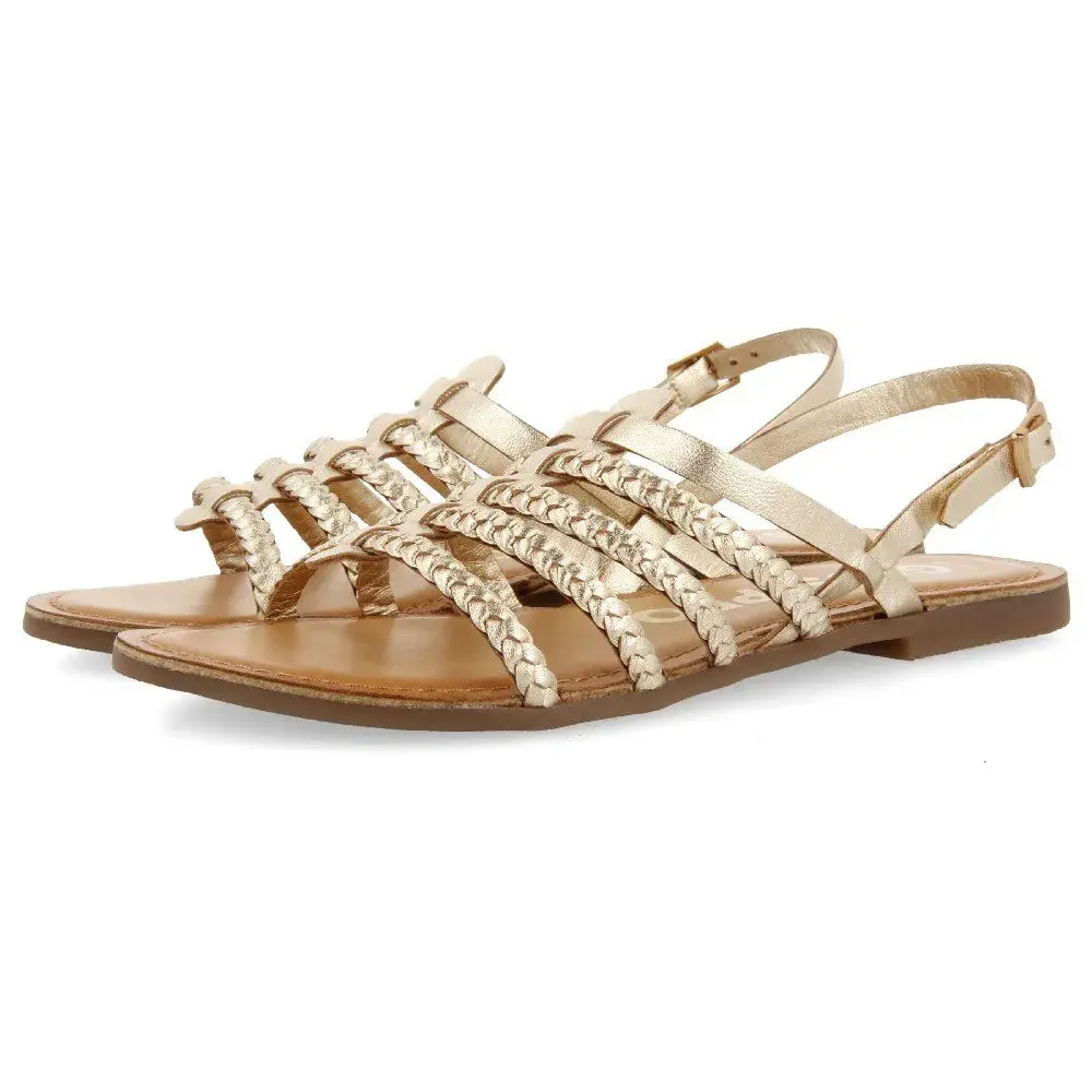 Золотистые кожаные сандалии с плетением и регулируемой застежкой с пряжкой на пятке.