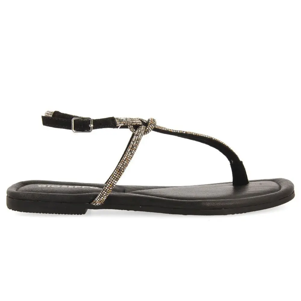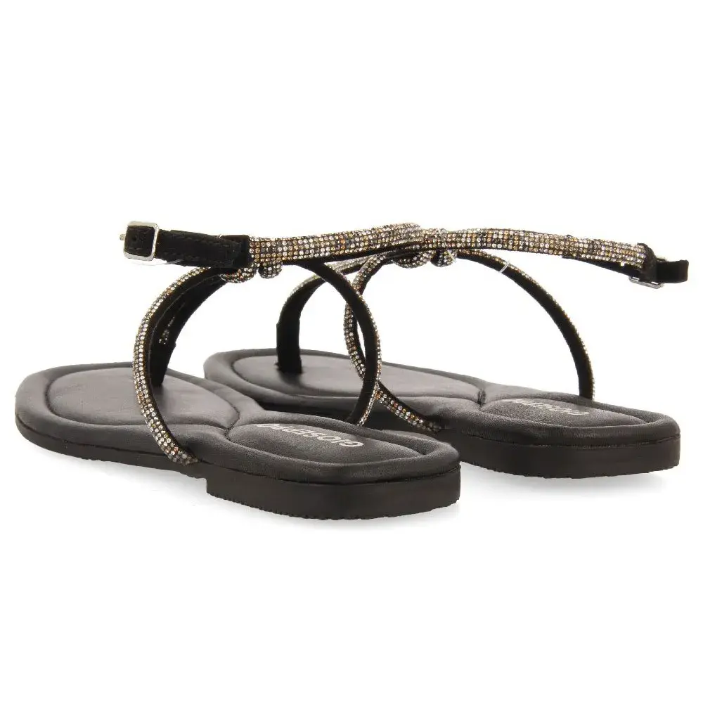 Черные кожаные сандалии с разноцветными ремешками из стразов.