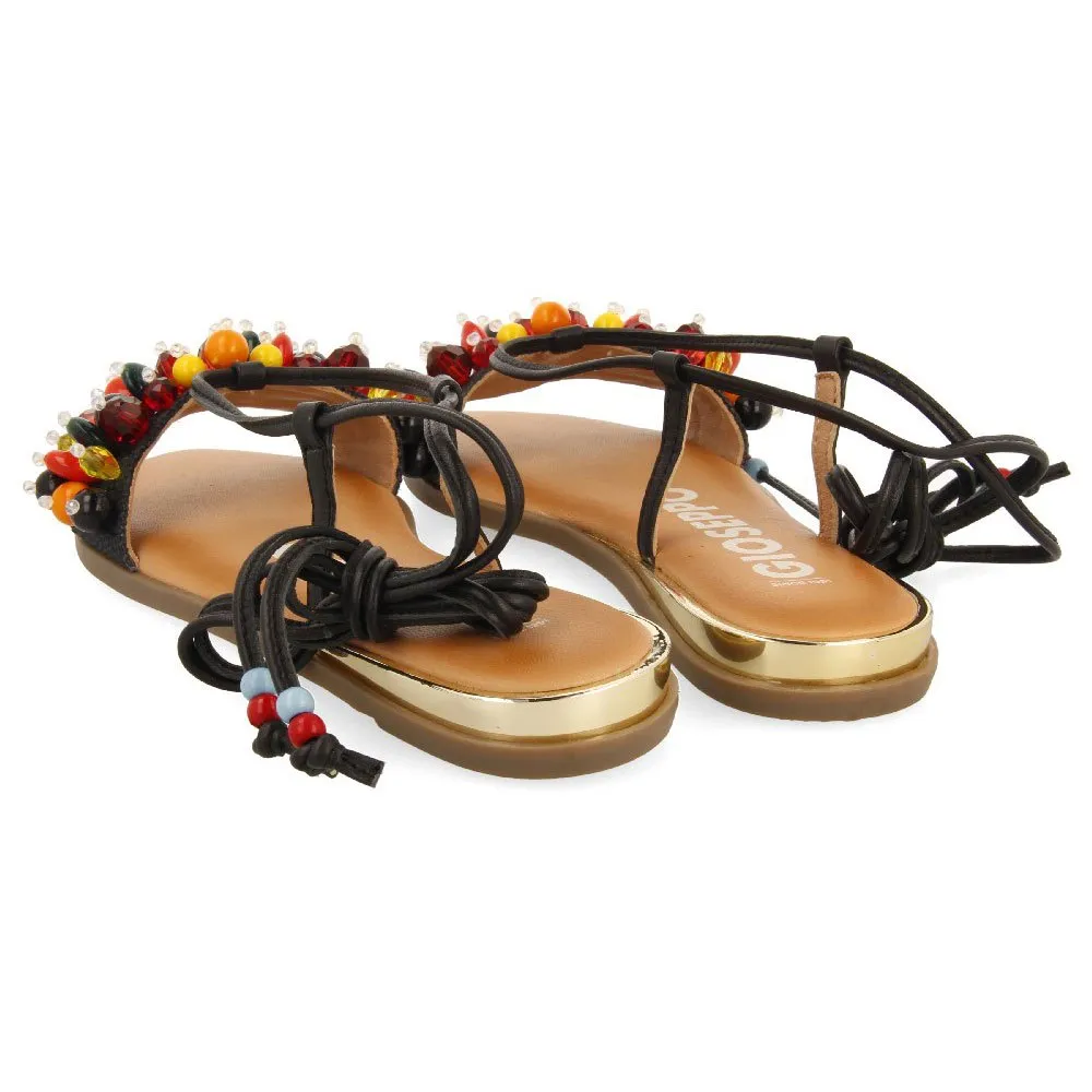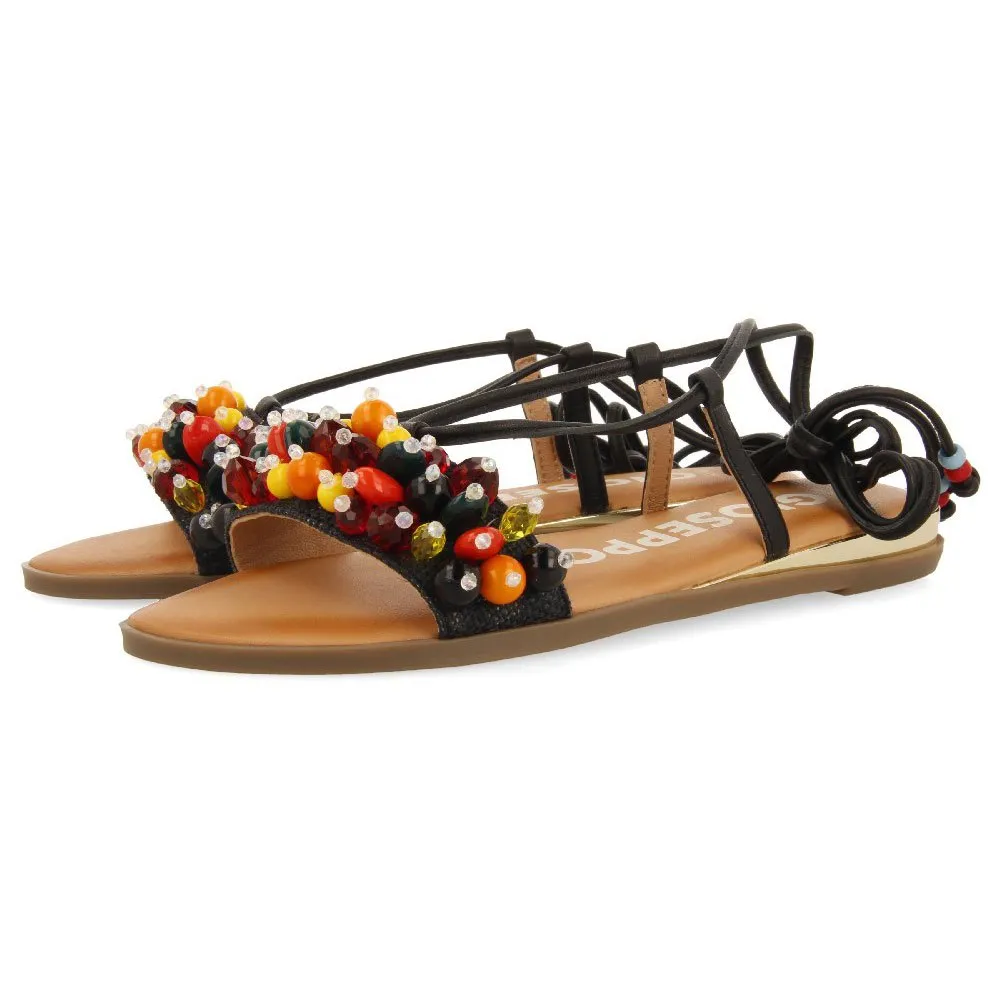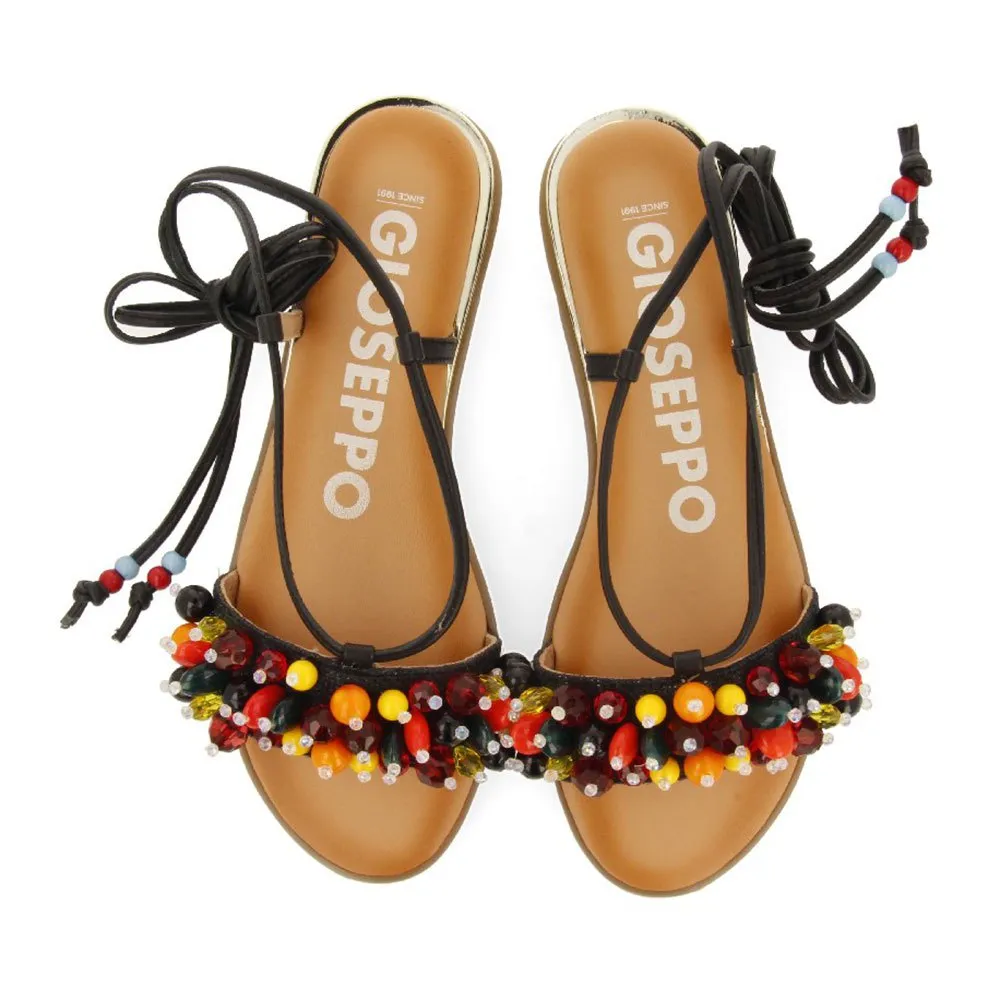 Вы будете сиять! Черные кожаные сандалии с разноцветными украшениями и ремешками.
