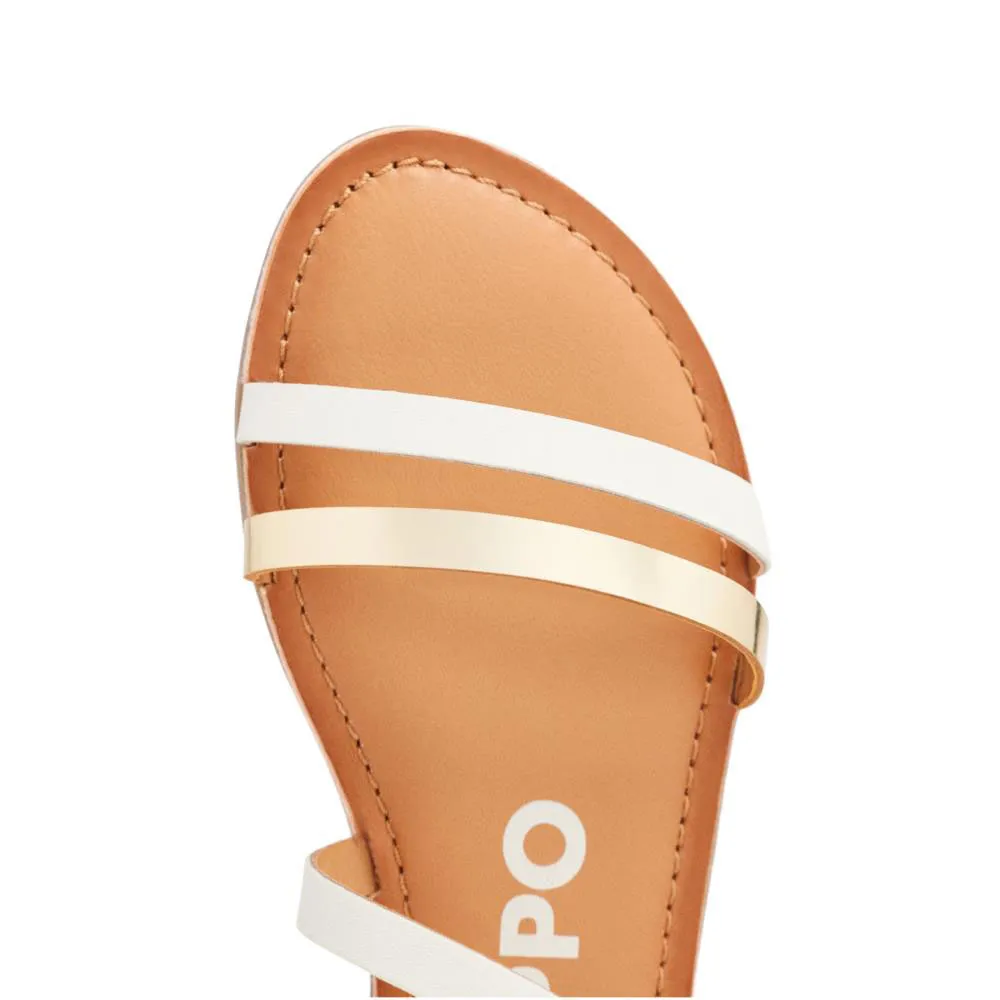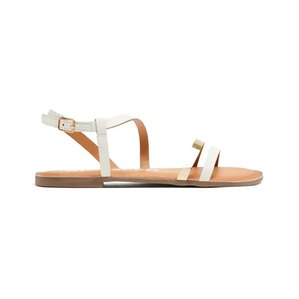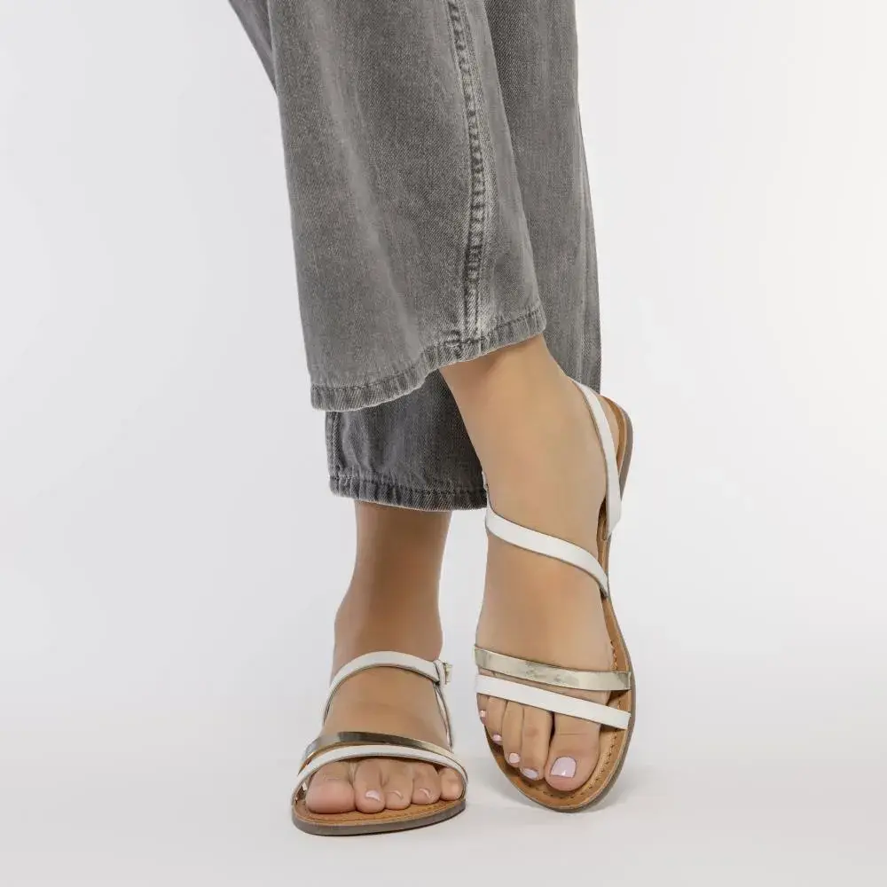 Эта деталь украсит любой образ! Кожаные сандалии с белыми и металлическими ремешками, регулируемой застежкой и пряжкой на пятке для лучшей поддержки.
