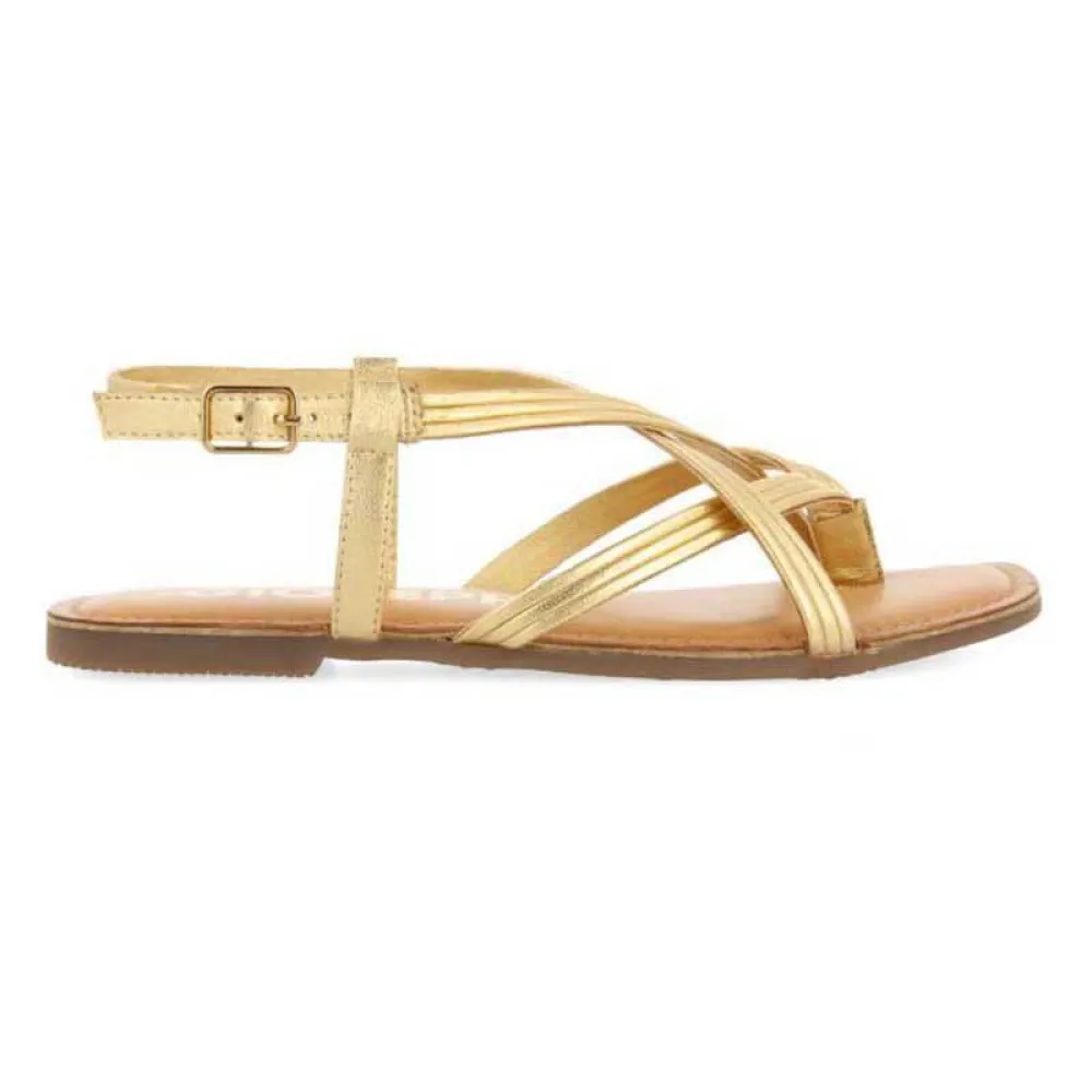 Золотистые кожаные сандалии с перекрещенными ремешками и регулируемой застежкой на щиколотке.