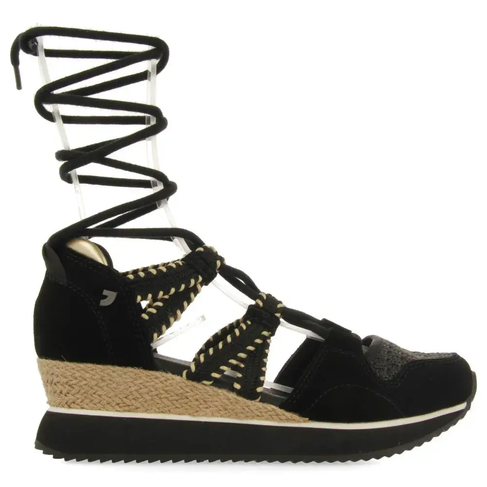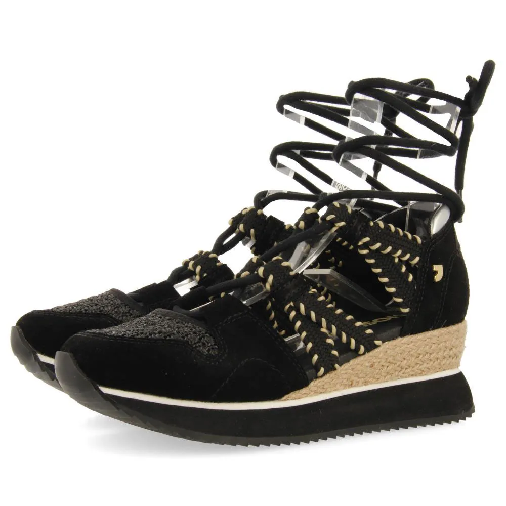 Открытые кожаные кроссовки с танкеткой из рафии.