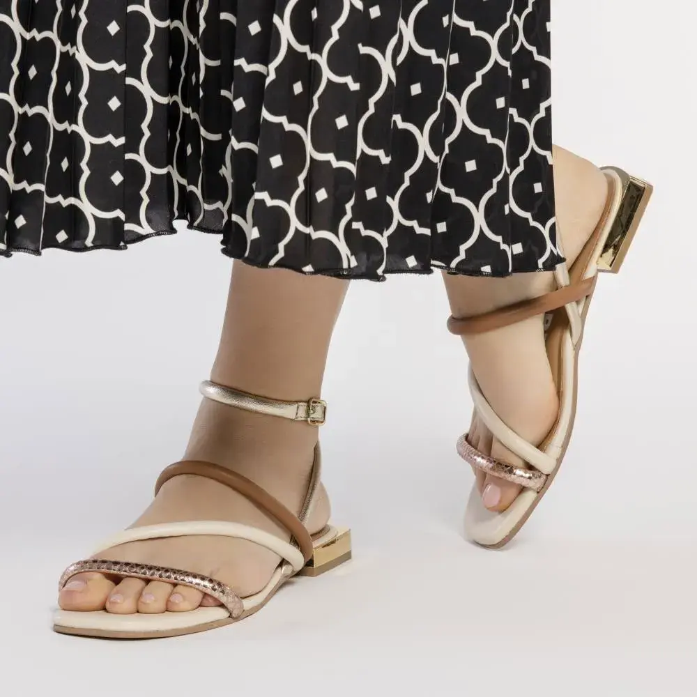 Идеально! Сандалии из светло-белой кожи с разноцветными и металлическими ремешками и регулируемой застежкой на щиколотке.