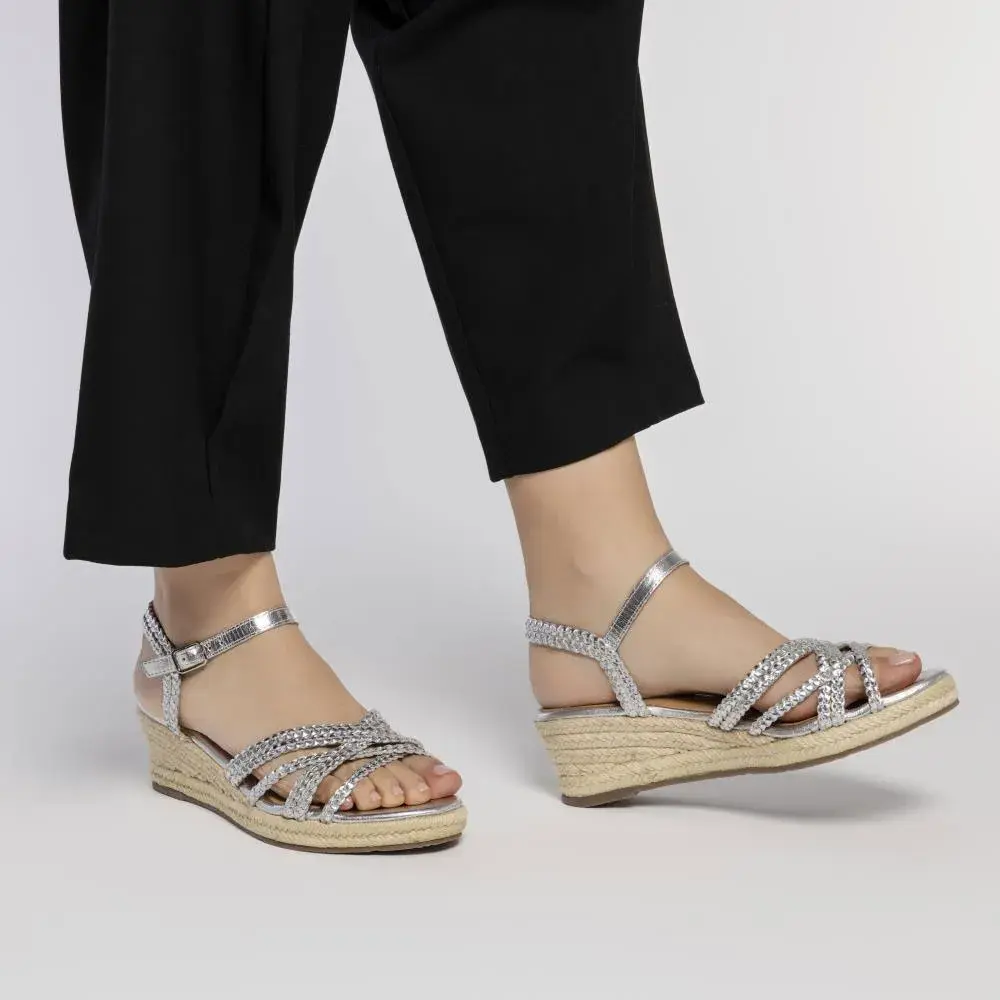 Кожаные сандалии с серебряными плетеными ремешками и джутовой танкеткой средней высоты.