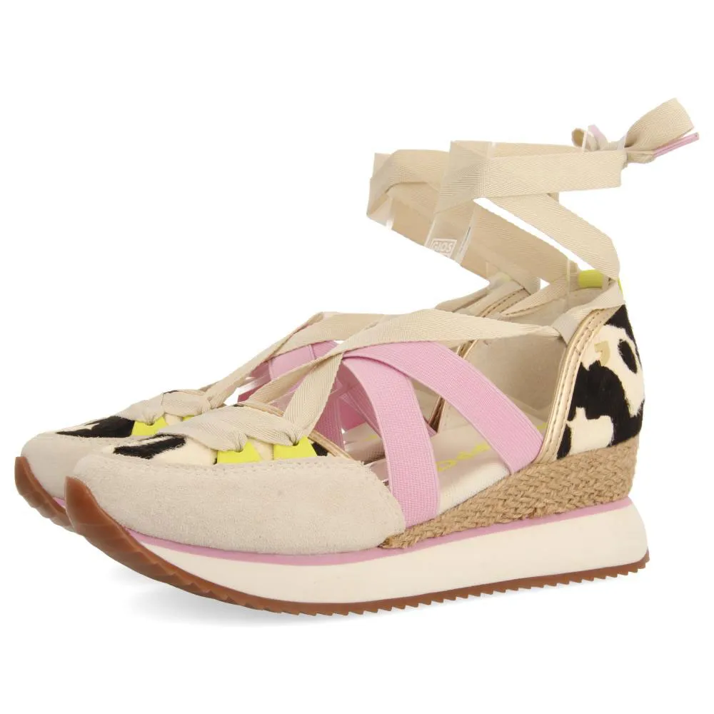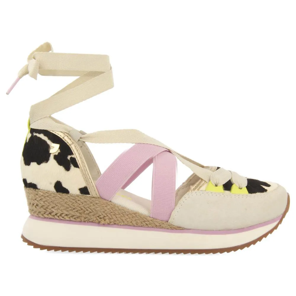 Кроссовки с открытым носком, принтом животных и танкеткой из рафии.