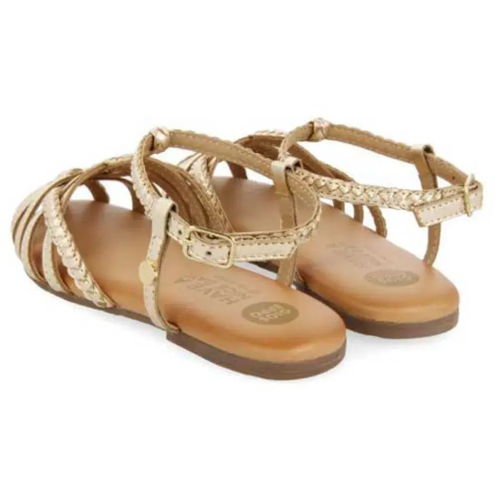 Сандалии из металлизированной золотистой кожи с рисунком в виде краба и плетеными ремешками.
