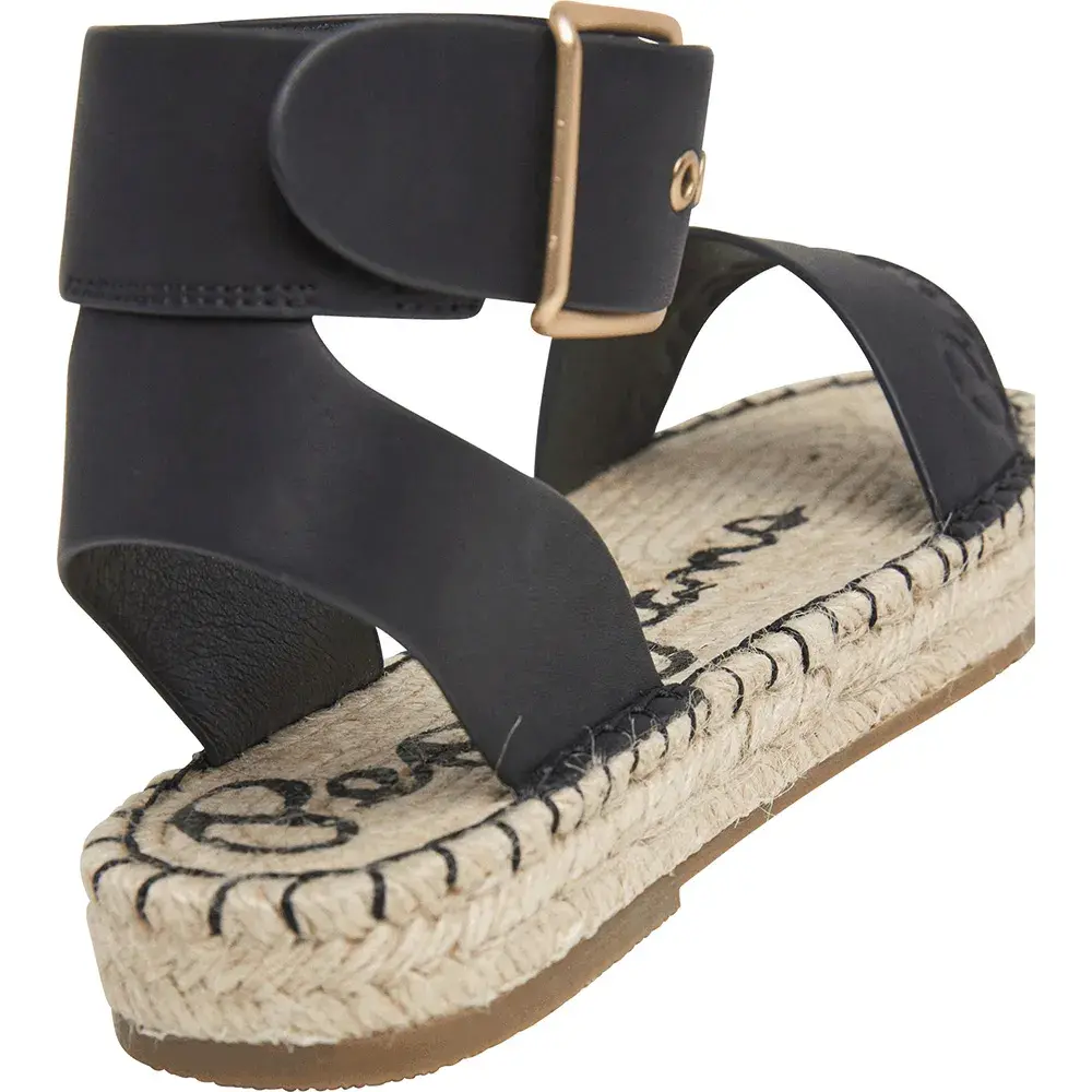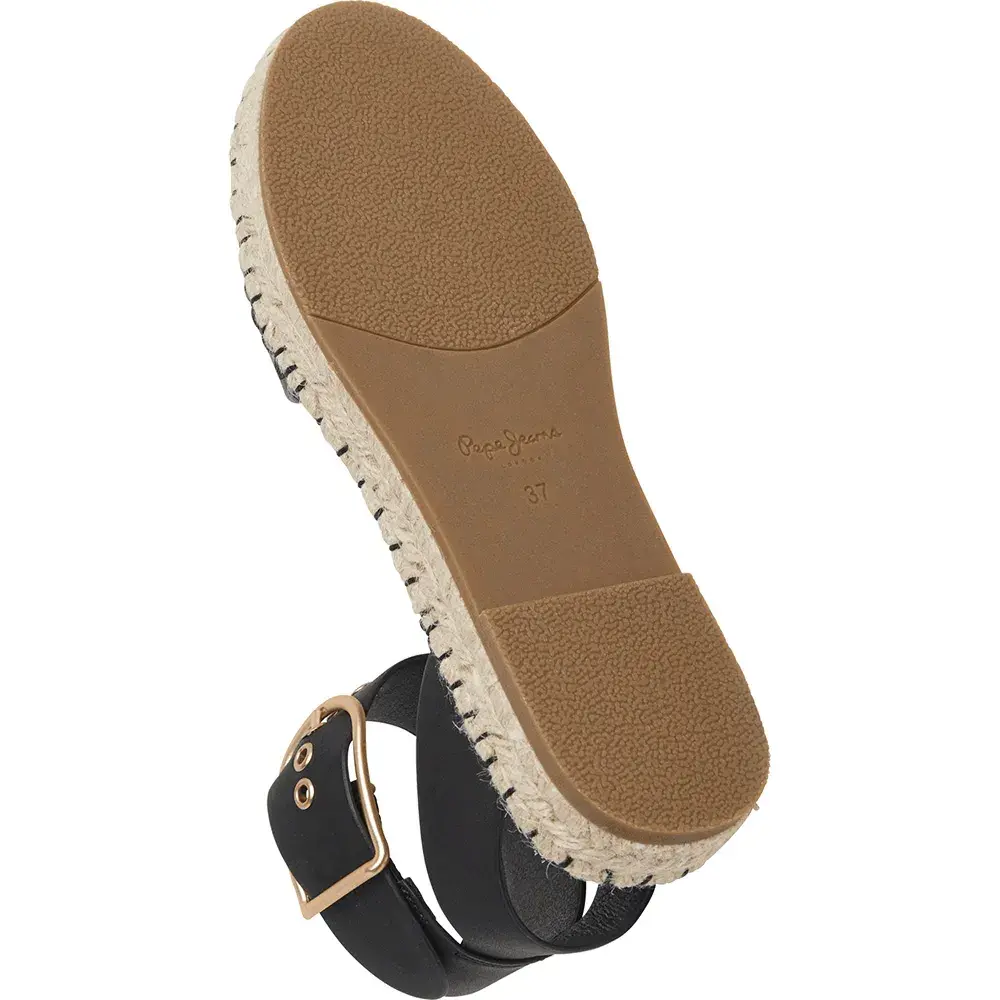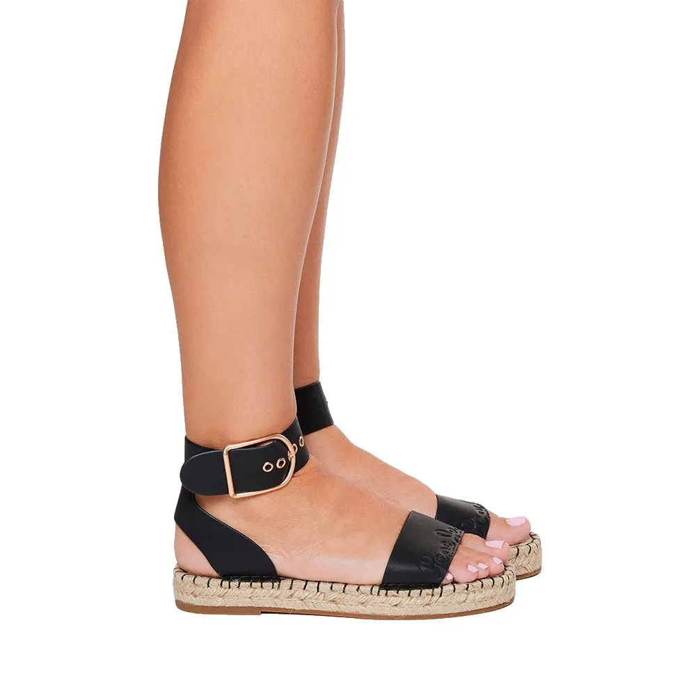 Плоские джутовые сандалии Arami Brand с глубоким тиснением классического логотипа на союзке, застежкой на щиколотке с помощью металлической пряжки, напечатанным классическим логотипом на стельке и подошвой из натурального джутового каната с массивной строчкой по периметру.