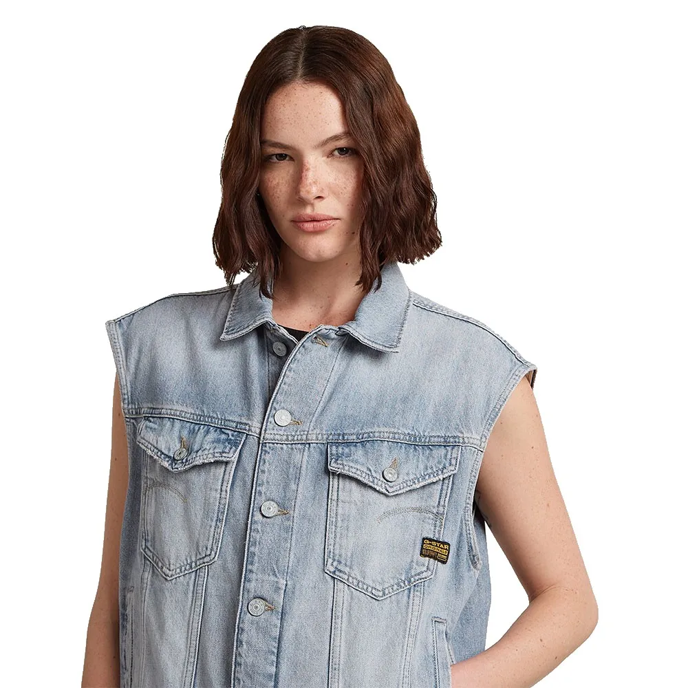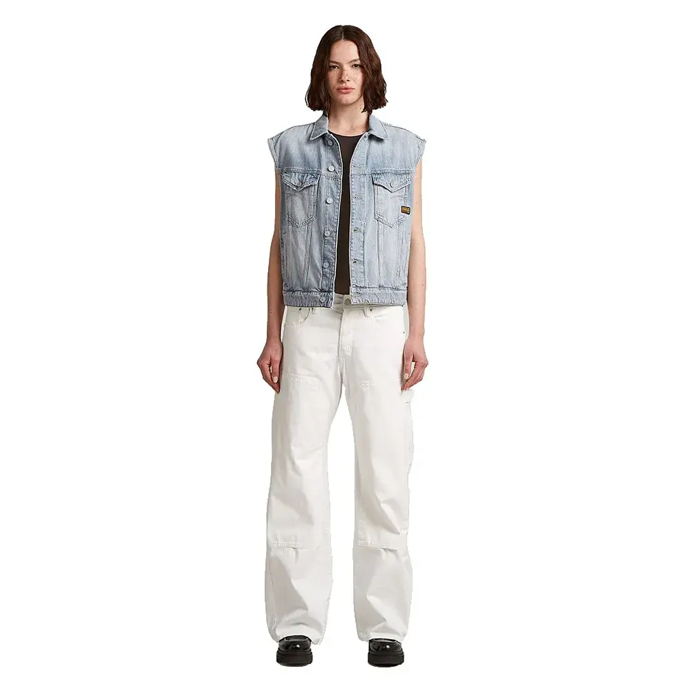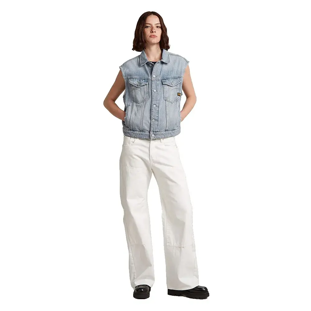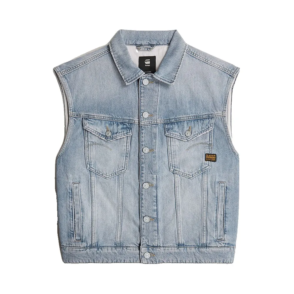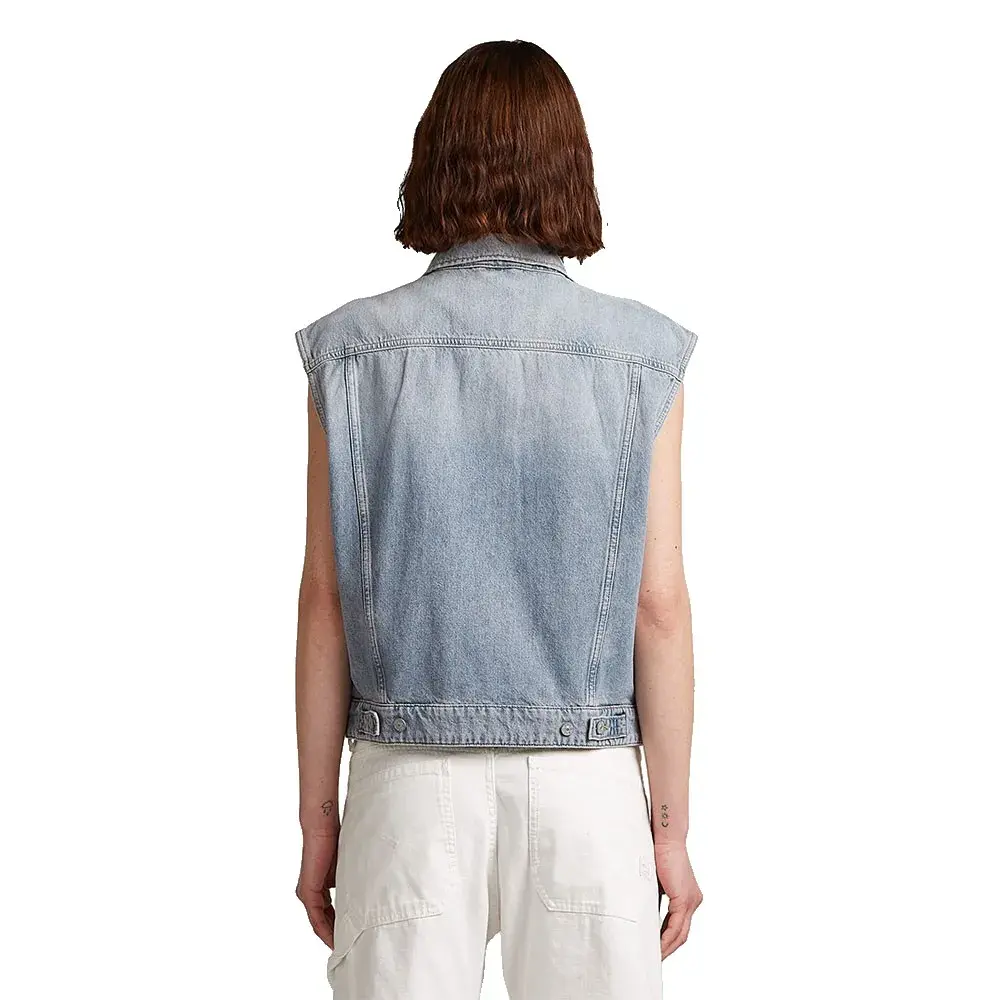Свободный джинсовый жилет имеет свободную посадку с классическим рубашечным воротником и гульфиком.