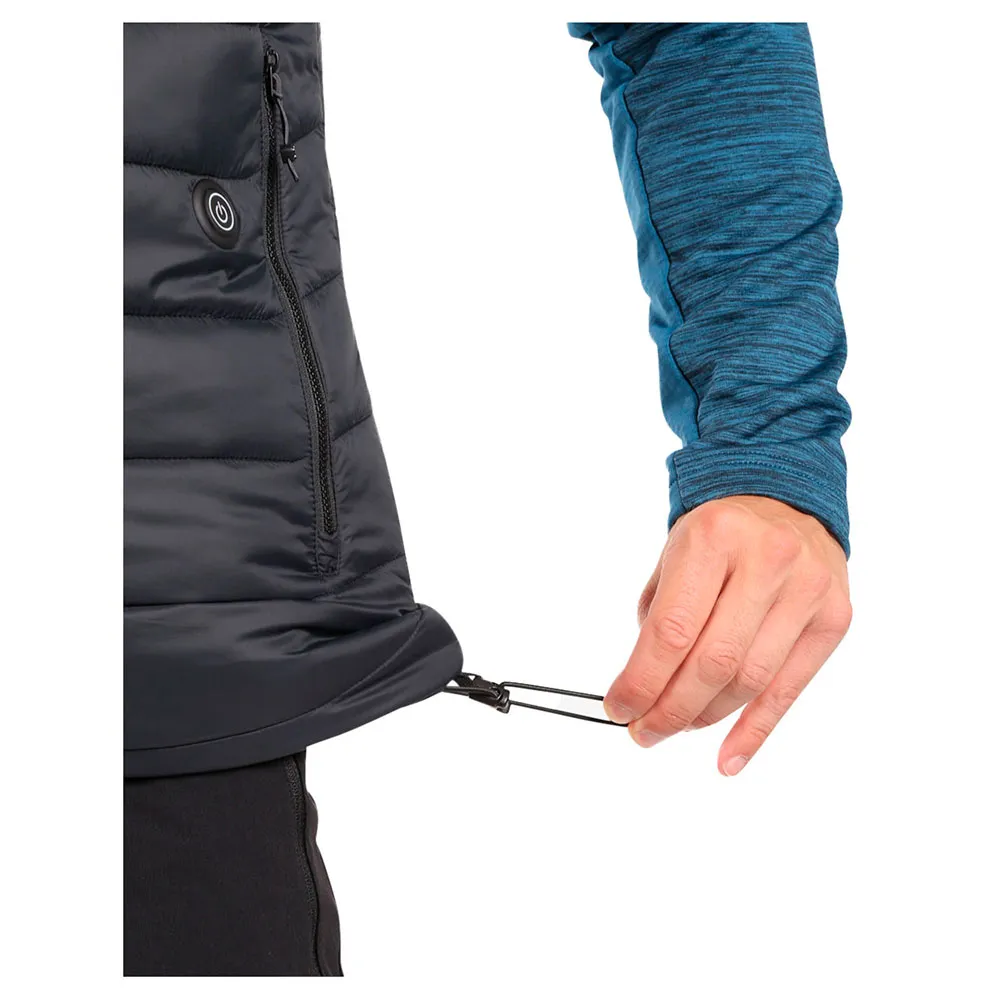Нагревательные панели расположены на груди и спине, управляются кнопкой рядом с карманом, при подключении к внешнему аккумулятору емкостью не менее 10 000 мАч.