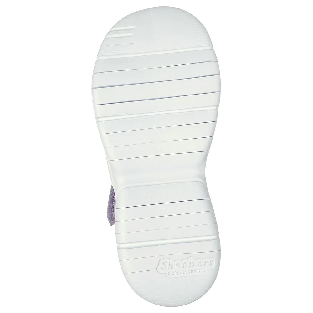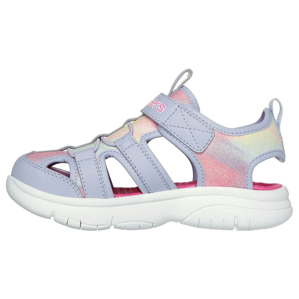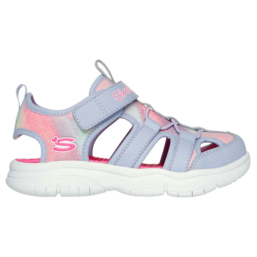 Проведите весь день под солнцем в Skechers Flex Splash - Daylight Shimmer. Эти сандалии с закрытым носком выполнены из синтетического материала с блестками омбре, эластичными шнурками, адаптивной застежкой Skechers и мягкой комфортной стелькой. Эта модель не светится.