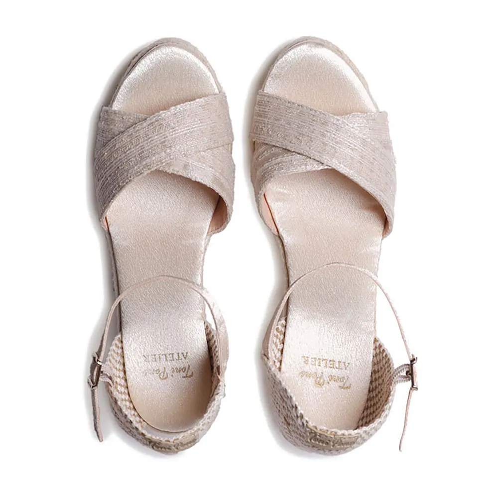 Эти открытые эспадрильи для невест изготовлены из ткани и люрекса с двумя перекрещенными ремешками.