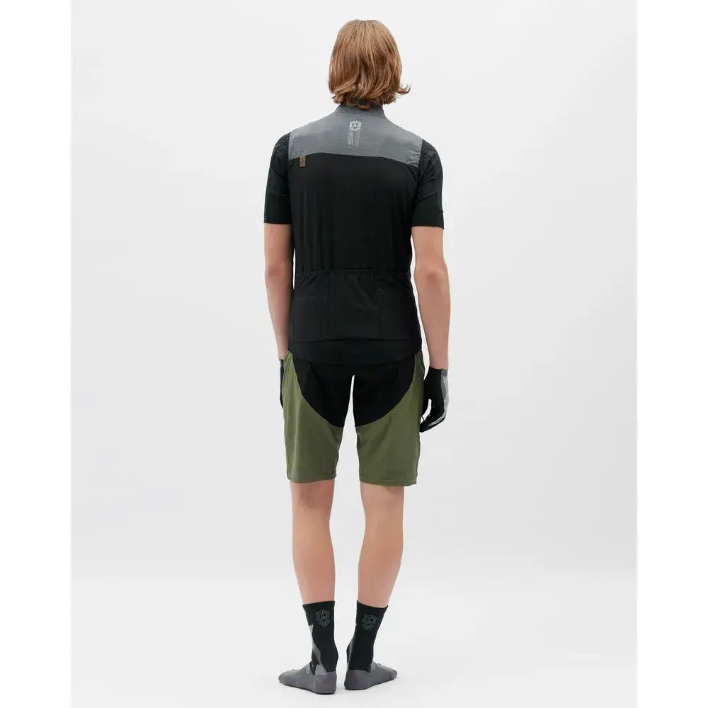Жилет имеет свободный крой и карман на молнии с декоративной нашивкой на груди.