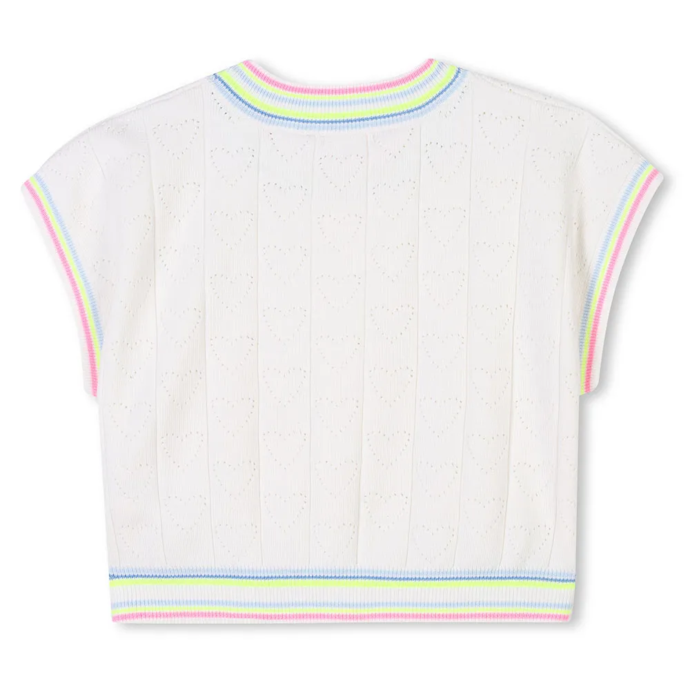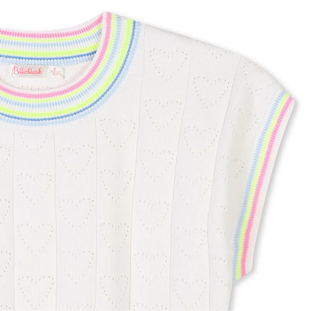 Вязаный свитер с открытыми сердечками, короткие рукава, полосатая резинка на воротнике, рукавах и низу, этикетка.